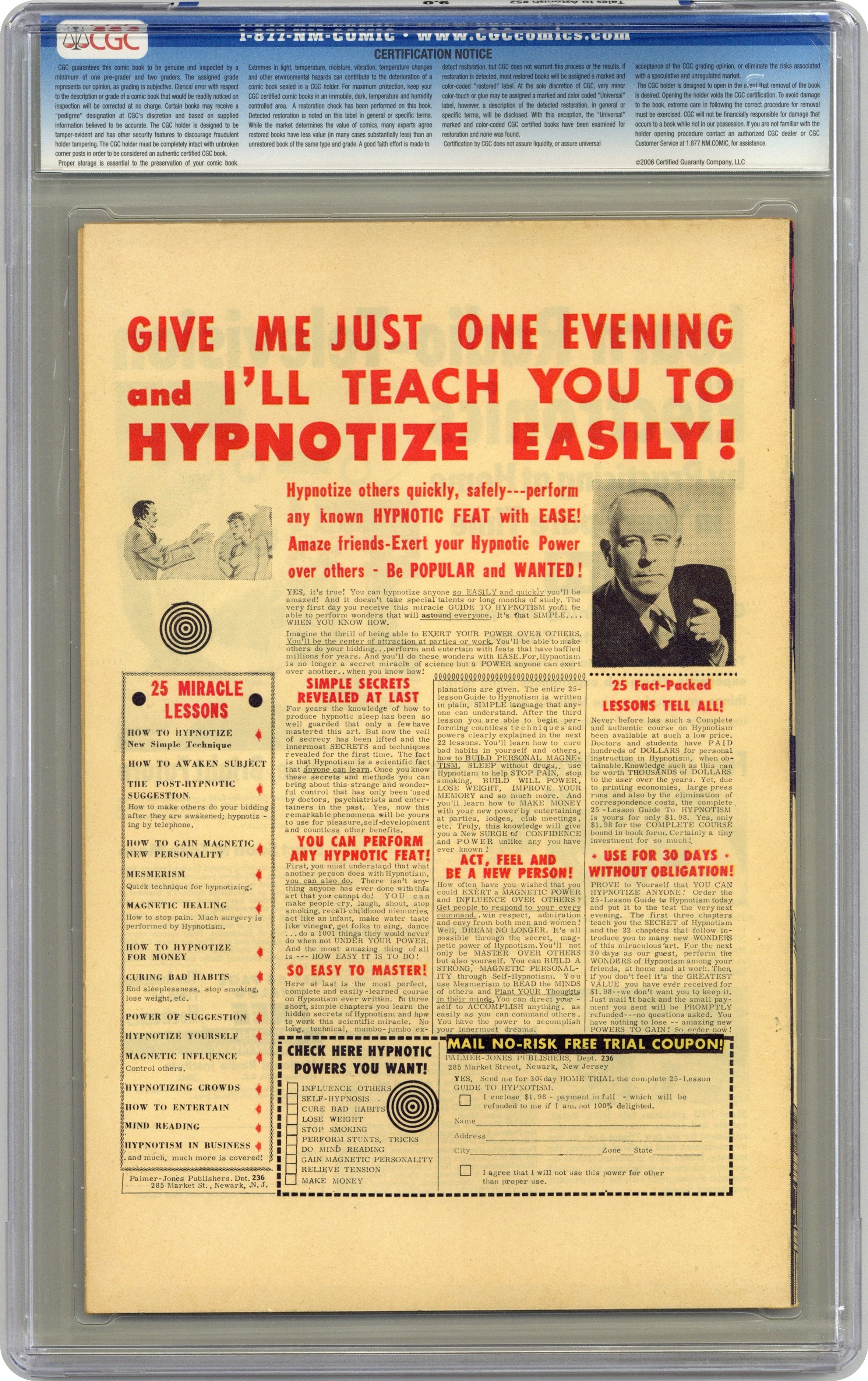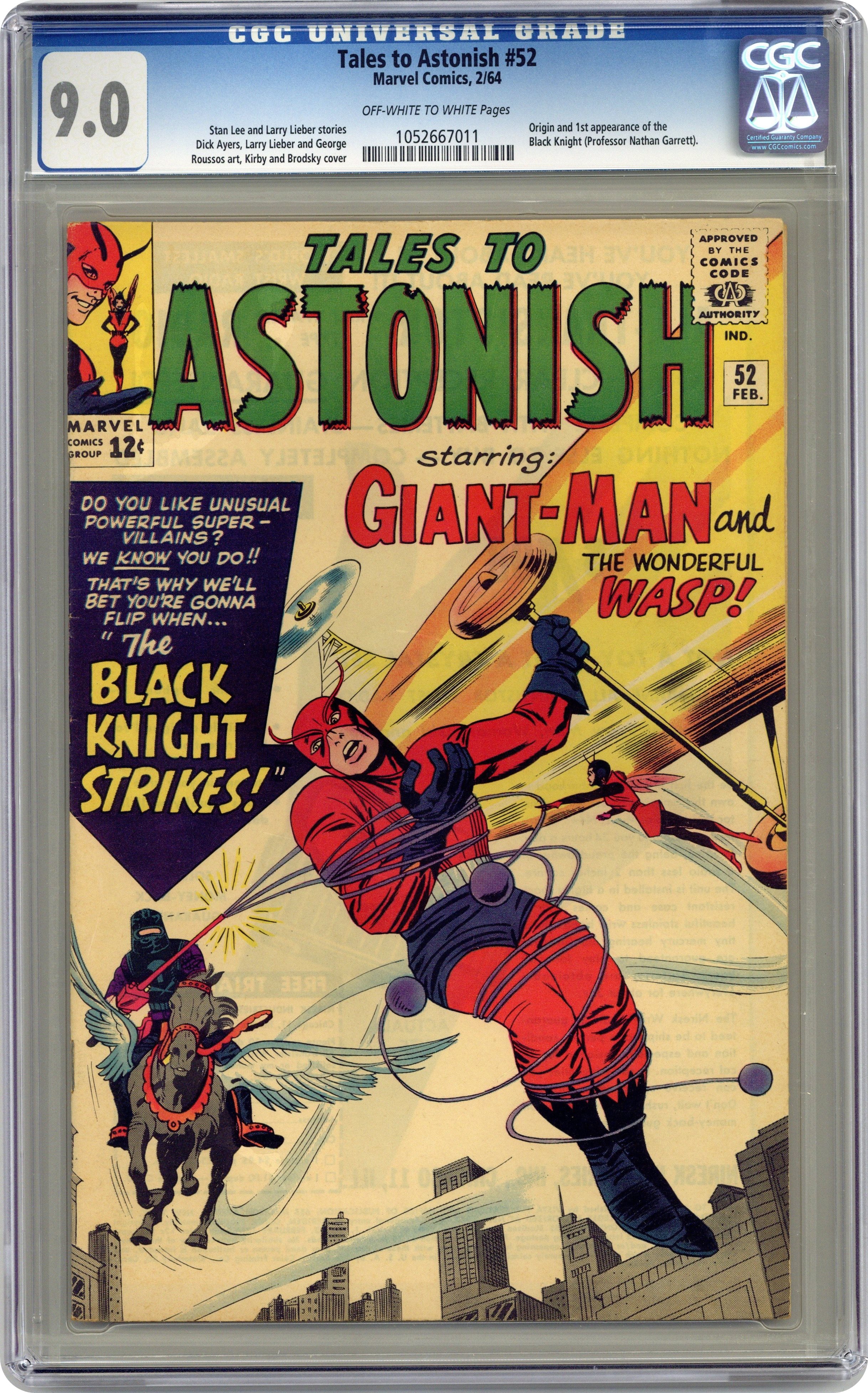 Cover by Jack Kirby and Sol Brodsky. The Black Knight Strikes!, script by Stan Lee, art by Dick Ayers; After being arrested for treason by Giant-Man, Professor Garrett flees to Europe where he manipulate the genes of horses and eagles to create a winged horse. X-Men #3 ad, art by Jack Kirby and Sol Brodsky. Avengers #3 ad, art by Jack Kirby and Paul Reinman. Not What They Seem!, script by Stan Lee and Larry Lieber, art by Larry Lieber and George Roussos [as G. Bell]; The Wasp tells the tale of prison escapees who try to avoid a planet with a trap, but are doomed when they take the wrong side in a battle of the sexes. 36 pgs., full color. $0.12. Cover price $0.12. Grade: CGC 9.0 explanation of grade Condition: Used (collectible)