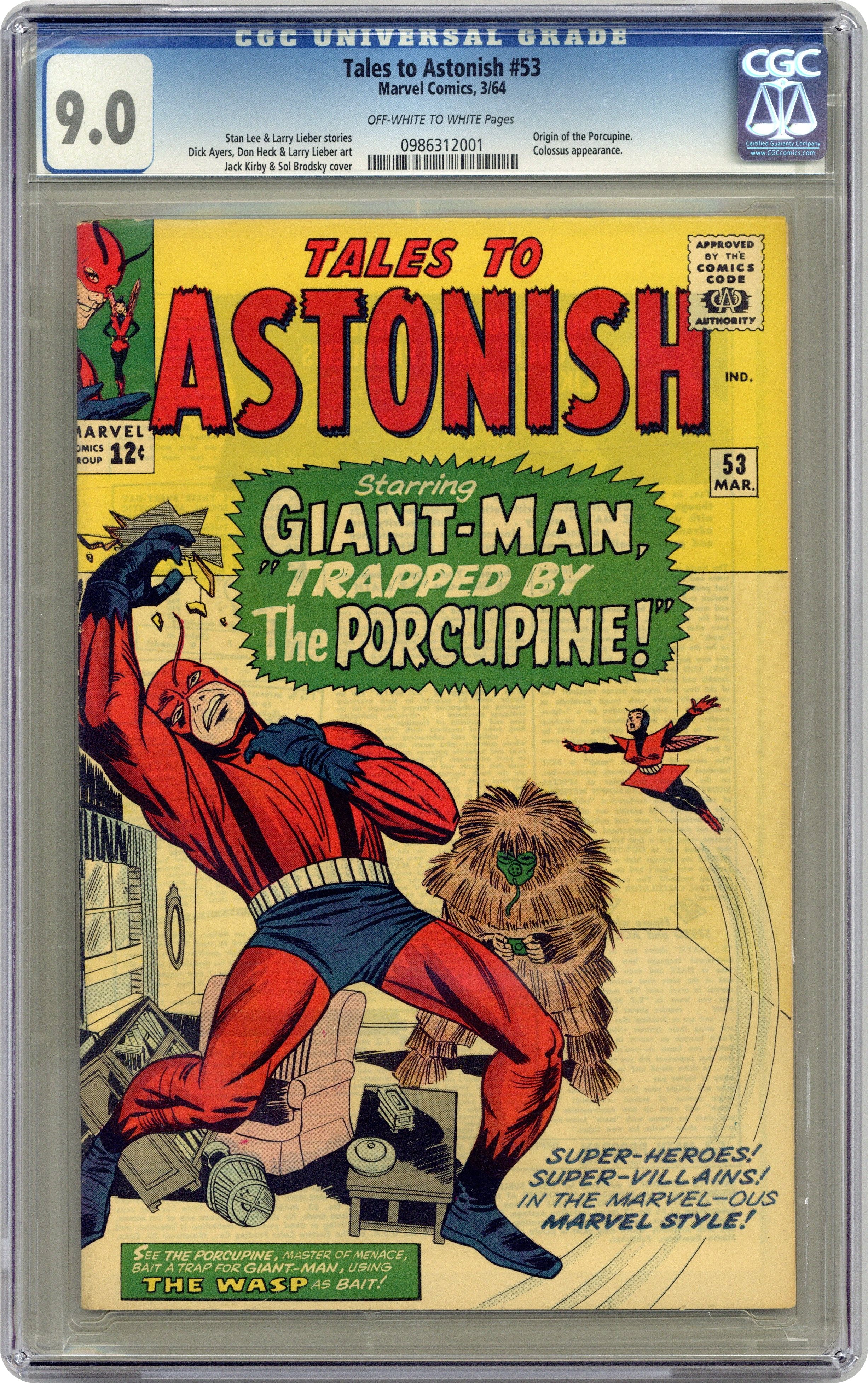 Ended Jan 19 2024 Winning Bid $161 Cover by Jack Kirby and Sol Brodsky. Trapped by the Porcupine!, script by Stan Lee, art by Dick Ayers; The Porcupine uses Giant-Man's fan club to attack him and then he captures the Wasp. The Clock text story. When Wakes the Colossus!, script by Stan Lee and Larry Lieber, art by Larry Lieber and Don Heck; An alien warlord builds a giant statue to intimidate the superstitious, but it comes to life and takes the side of the rebels against him. 36 pgs., full color. $0.12. Cover price $0.12. Grade: CGC 9.0 explanation of grade Condition: Used (collectible)
