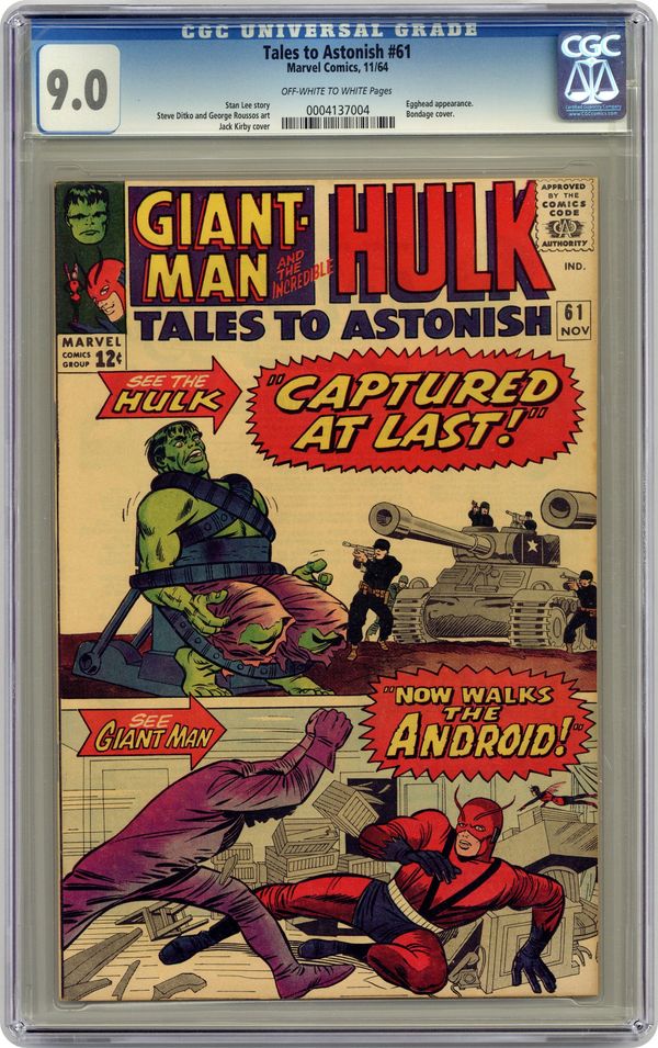 Ended Jul 12 2023 Winning Bid $156 1st appearance of Glen Talbot - Cover by Jack Kirby and Chic Stone. Now Walks the Android, script by Stan Lee, art by Steve Ditko, Joe Orlando, and George Roussos (as George Bell); Egghead uses a simple clothing store dummy to create a giant and powerful android which he plans on controlling mentally as it battles and defeats Giant-Man; He entices his arch-foe into his trap with the promise of a television series based on his heroic exploits (actually, it is Jan who is pretty keen on getting Hank into show biz). Captured at Last!, script by Stan Lee, art by Steve Ditko and George Roussos (as George Bell); The Hulk takes on the indestructable Banner created robot and, in one of the more dubious plot devices in comics, succeeds in kicking him down a bottomless hole when he realizes that he cannot beat the machine; Glenn Talbot arrives on gamma base sent by the Pentagon to keep an eye on the suspicious activity of Bruce Banner; Glenn decides that keeping an eye on Betty seems like a good idea as well. 36 pgs., full color. $0.12. Cover price $0.12. Grade: CGC 9.0 explanation of grade Condition: Used (collectible)
