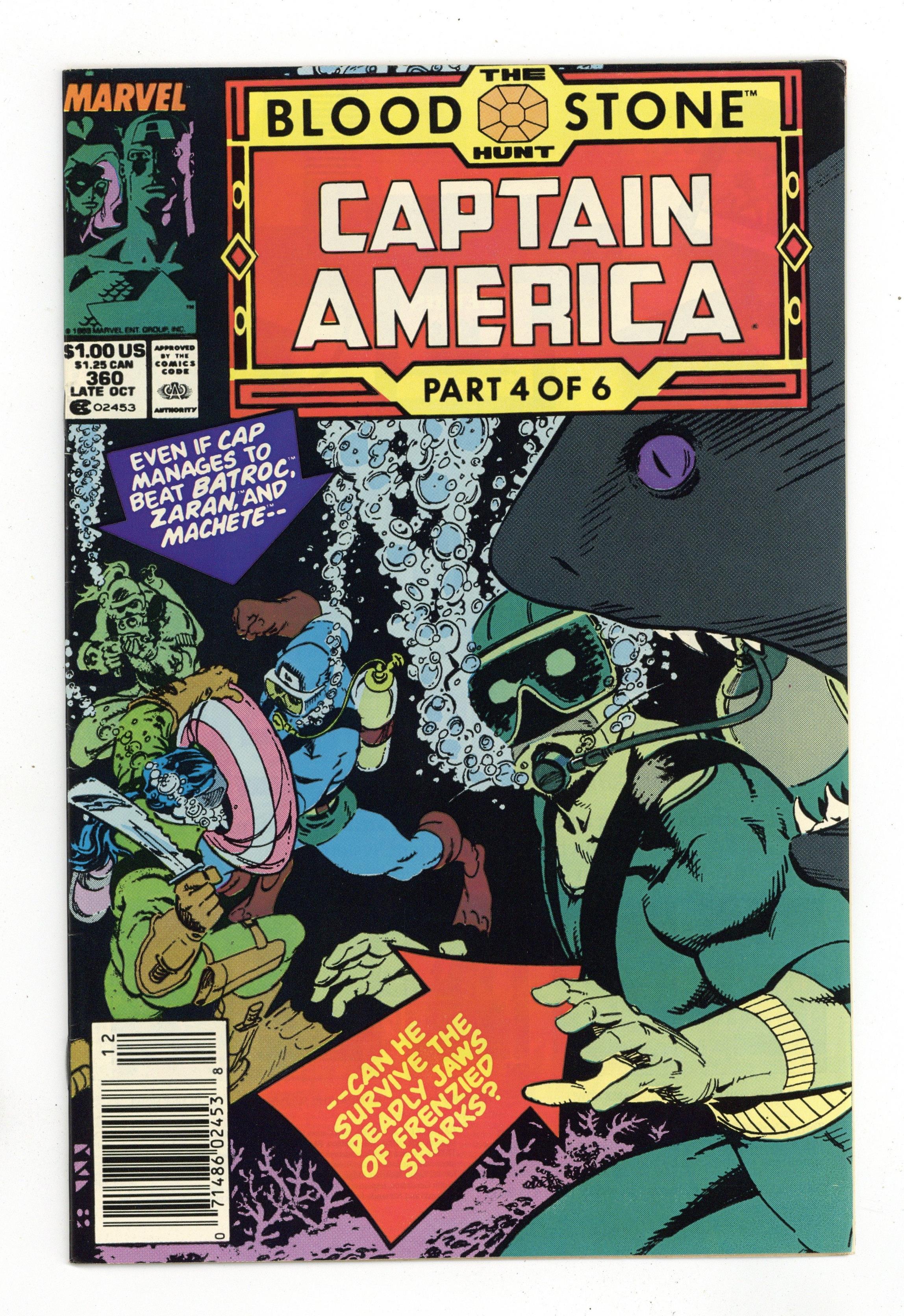 Direct Edition. "Blood in the Sea" Part 4 of 6. Story by Mark Gruenwald and Kieron Dwyer. Art by Kieron Dwyer and Danny Bulanadi. Cover by Kieron Dwyer and Al Milgrom. Off the Bermuda shore, an undersea battle is in progress among Captain America, Batroc, Machete, and Zaran; when suddenly a school of sharks decides to join the action! Meanwhile, Diamondback sneaks on board Baron Zemo's yacht and pilfers two of the bloodstone jewels. At the end of the day, Cap and Diamondback have two of the five bloodstone jewels and Baron Zemo has one. The hunt for the remaining two continues in Egypt. First appearance of Crossbones. Back up story: "Conflagration" Part 3 of the Night of the Scourge. Story by Mark Gruenwald. Art by Mark Bright and Don Hudson. The U.S. Agent battles Scourge, but only one of them will be left standing by night's end! 36 pgs. Cover price $1.00. Grade: FN 6.0 explanation of grade Condition: Used (collectible)