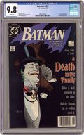 First printing. Direct Edition. Cover art by Mike Mignola. "A Death in the Family" part 4 of 4, script by Jim Starlin, pencils by Jim Aparo, inks by Mike DeCarlo; Batman and Superman talk to CIA agent Ralph Bundy about the Joker's diplomatic status; The agent tries to get Batman to leave the Joker alone; Batman goes to the Joker's hotel room; The Joker confirms that he killed Jason; The Joker pulls a gun, but Batman is already gone; At the UN the Joker tries to poison the audience; Fortunately, Superman sucks up all the poison and flies out of the room to release it; The Joker activates bombs; Batman pursues him. NOTE: Most issues from 397-432 were reprinted in 1989 and sold in multipacks. These 2nd and 3rd prints have back cover ads dated 1989. 36 Pages, Full Color. Cover price $0.75. Grade: CGC 9.8 explanation of grade Condition: Used (collectible)