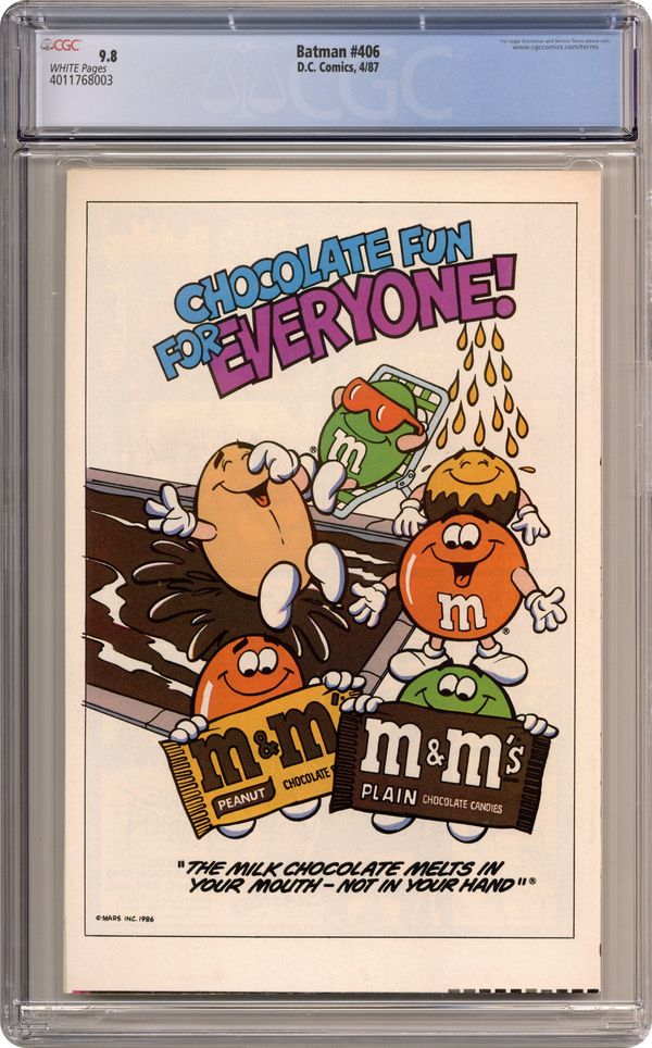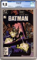 First Printing. Direct Edition. Batman Year One, Chapter Three: "Black Dawn". Part 3 of 4, continued from the previous issue. Story concludes next issue. An injured and cornered Batman is up against the police, James Gordon crosses a line, and Selina Kyle becomes Catwoman. Script by Frank Miller, art by David Mazzucchelli. Mazzucchelli cover. 1st printing. NOTE: Most issues from 397-432 were reprinted in 1989 and sold in multipacks. These 2nd and 3rd prints have back cover ads dated 1989. 36 Pages, Full Color. Cover price $0.75. Grade: CGC 9.8 explanation of grade Condition: Used (collectible)