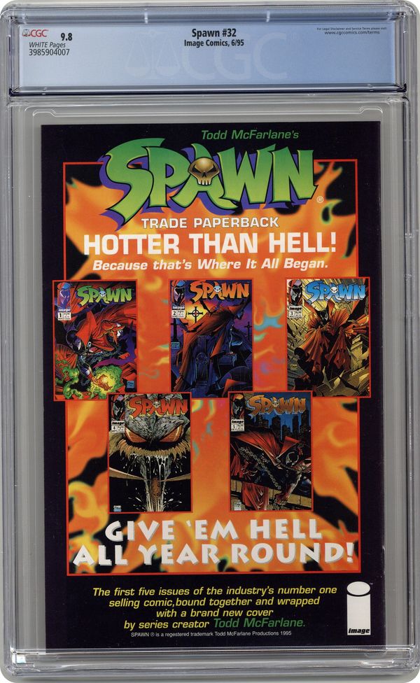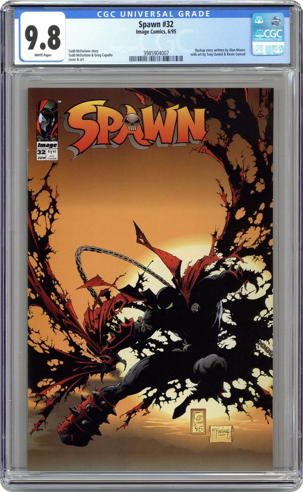Direct Edition. "Appearances!" Story by Todd McFarlane. Art by Greg Capullo and Todd McFarlane. Spawn's symbiotic costume mutates to become more formidable than ever. Just in time for him and the Redeemer to settle their differences, once and for all. Includes the 6-page prelude to Spawn: Blood Feud by Alan Moore and Tony Daniel. Cover price $1.95. Grade: CGC 9.8 explanation of grade Condition: Used (collectible)