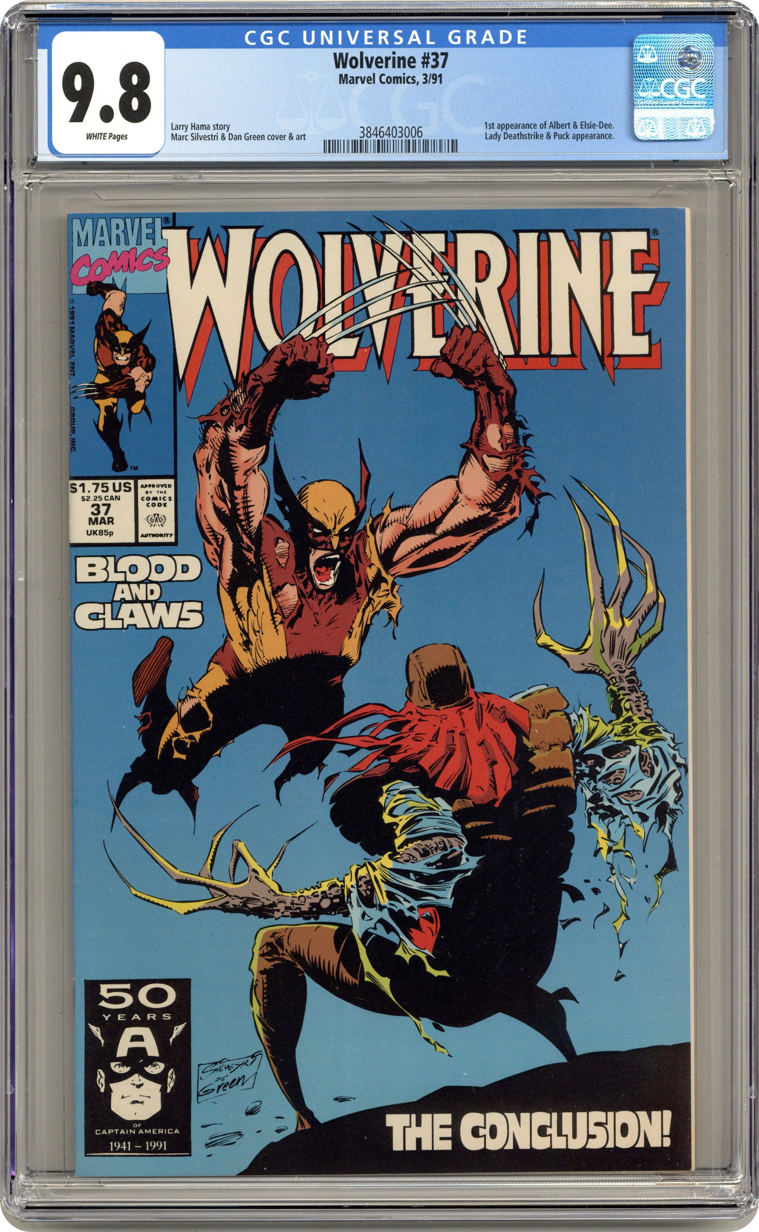 Blood, Sand and Claws: Part 3 of 3 - Guest-starring Puck. "Fall Back and Spring Forward!" Written by Larry Hama. Art by Marc Silvestri and Dan Green. Wolverine and Puck settle the score with Lady Deathstrike back in the present. Meanwhile, the cyborg villain Donald Pierce puts the finishing touches on his latest weapon against his hated enemy, Wolverine. 32 pages, FC Cover price $1.75. Grade: CGC 9.8 explanation of grade Condition: Used (collectible)