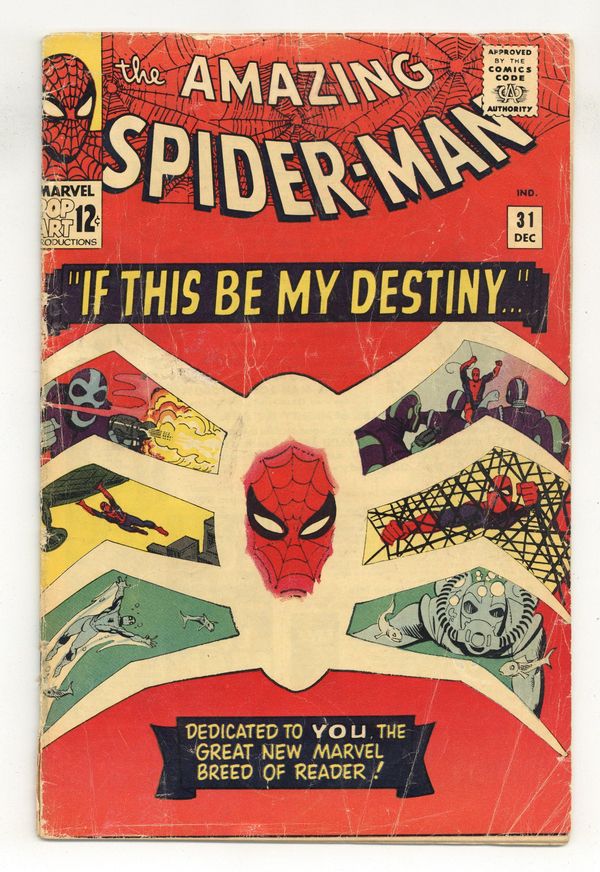 Cover by Steve Ditko. First appearances of Gwen Stacy, Harry Osborn, and Professor Warren. First appearance of the Master Planner (revealed in issue 32 to be Doctor Octopus) in "If This Be My Destiny, script by Steve Ditko (plot) and Stan Lee (script), art by Steve Ditko; Aunt May falls deathly ill on Peter's first day of college. Meanwhile, the Master Planner is stealing scientific gadgets. Marvel Bullpen Bulletins, art by Steve Ditko and Marie Severin; Bullpen Bulletins page discussing staff; Marvel Checklist; ads for Spider-Man T-Shirt and MMMS. Letter to the editor from comics writer Don McGregor. Reprinted in Marvel Tales # 24 and 170. 36 pgs., full color. $0.12. Cover price $0.12. Grade: GD 2.0 explanation of grade Condition: Used (collectible)