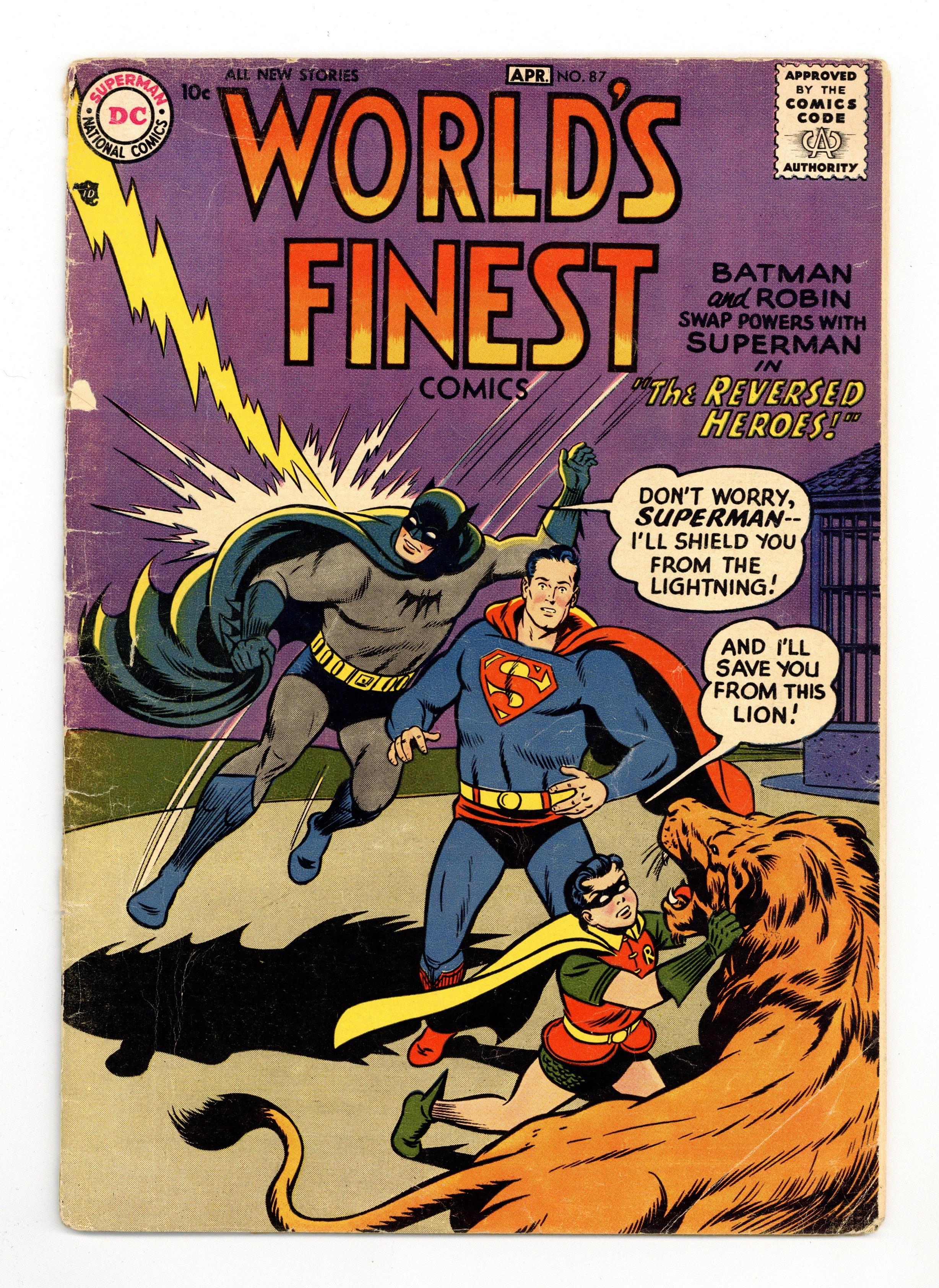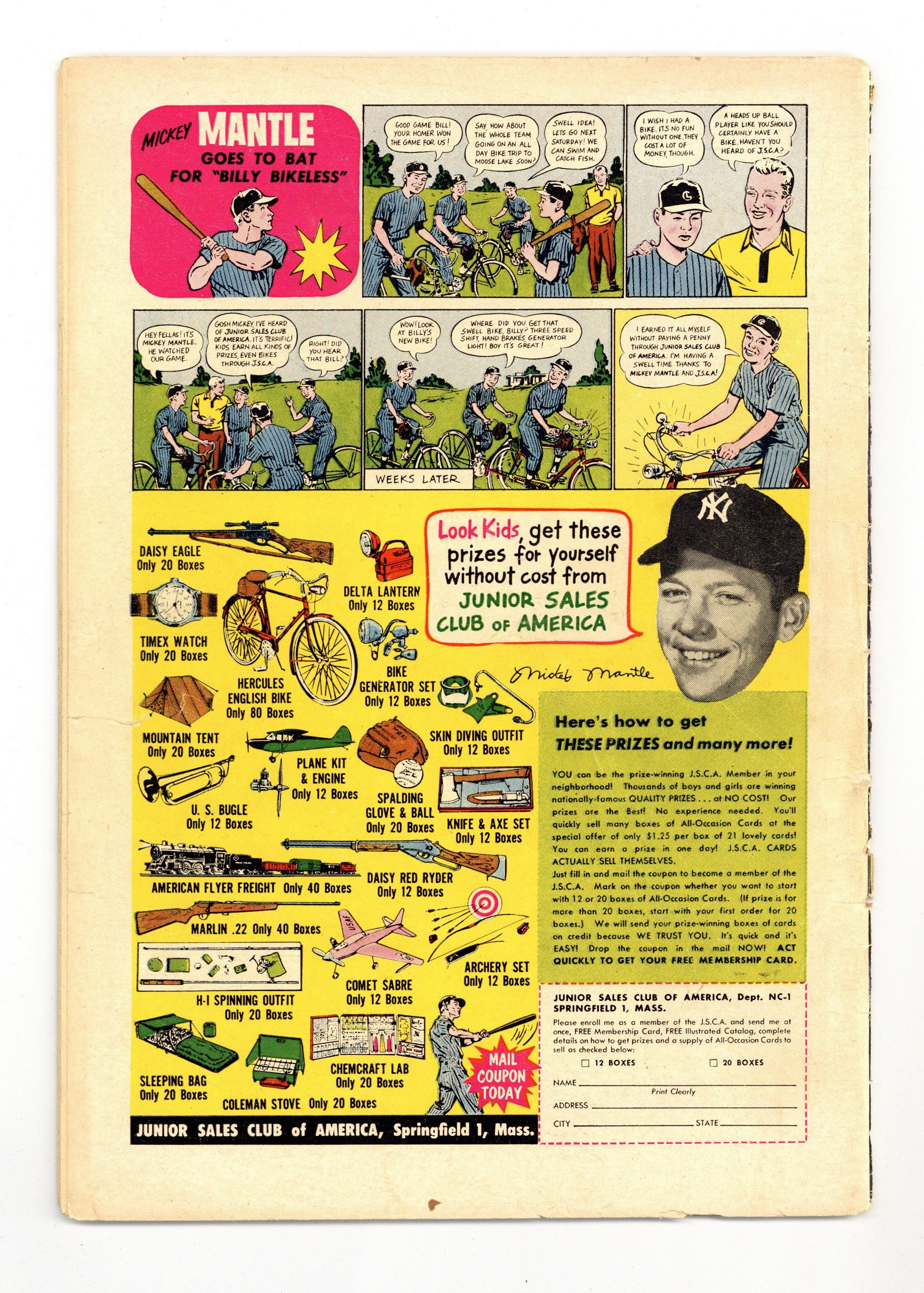 Cover pencils by Curt Swan, inks by Stan Kaye. The Reversed Heroes, script by Bill Finger, pencils by Dick Sprang, inks by Ray Burnley; When Elton Craig finds some capsules from Krypton, he takes one and gains superpowers; He captures Superman with some Kryptonite, so Superman takes one of the pills and loses his superpowers; He contacts Batman and Robin, who take the pills and gain superpowers and stop Elton's crime spree. Special Brotherhood Week Quiz public service announcement starring Buzzy, script by Jack Schiff, art by Ruben Moriera. The Green Sword starring Green Arrow, art by George Papp; Green Arrow adopts a sword as his weapon and abandons his arrows. Lionel and his Lions humor page by Henry Boltinoff. Secret Below the Sea text story. The Retirement of Tomahawk, art by Nick Cardy. 36 Pages, Full Color. Cover price $0.10. Grade: GD+ 2.5 explanation of grade Condition: Used (collectible)