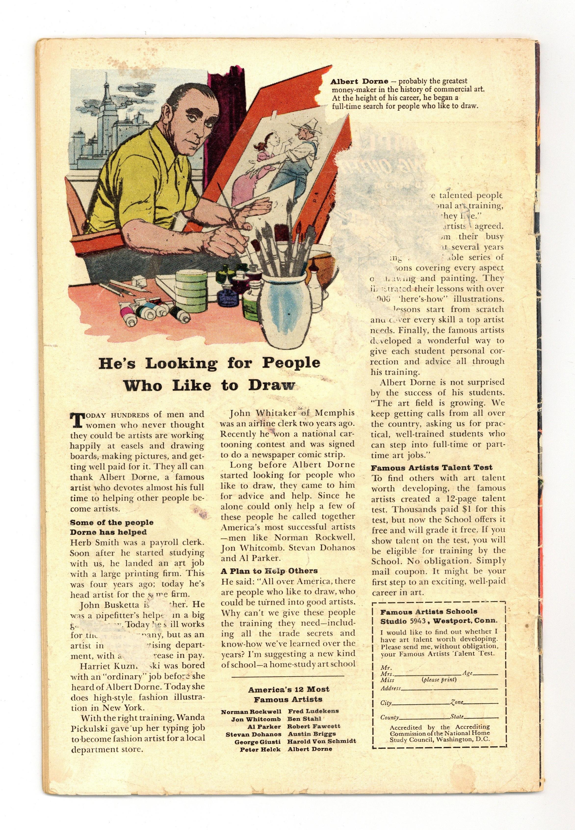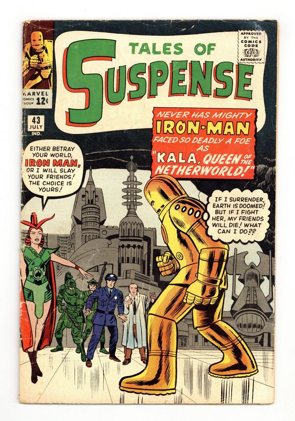 Cover pencils by Jack Kirby, inks by Dick Ayers. "Kala, Queen of the Netherworld!", script by Stan Lee (plot) and Robert Bernstein (script) (as R Berns), pencils by Jack Kirby, inks by Don Heck; Tony Stark is abducted by the queen of an underground kingdom to help her invade the surface; As Iron Man, Stark shows her that she would rapidly age on the surface, convincing her to call off the invasion. "The Journey" text story. "You Can't Change the Past!", script by Stan Lee, art by Steve Ditko; A scientist creates a time machine just to prove that it can be done, but never plans to use it, since he knows that it would be too dangerous to attempt to alter the past. "I Was A Victim of Venus!", script by Stan Lee (plot) and Larry Lieber (script), pencils by Larry Lieber, inks by Matt Fox; A criminal steals a valuable diamond from Venus, but it is irradiated and makes him sick; He needs to steal the money to pay a doctor. 36 pgs., full color. $0.12. Cover price $0.12. Grade: GD- 1.8 explanation of grade Condition: Used (collectible)