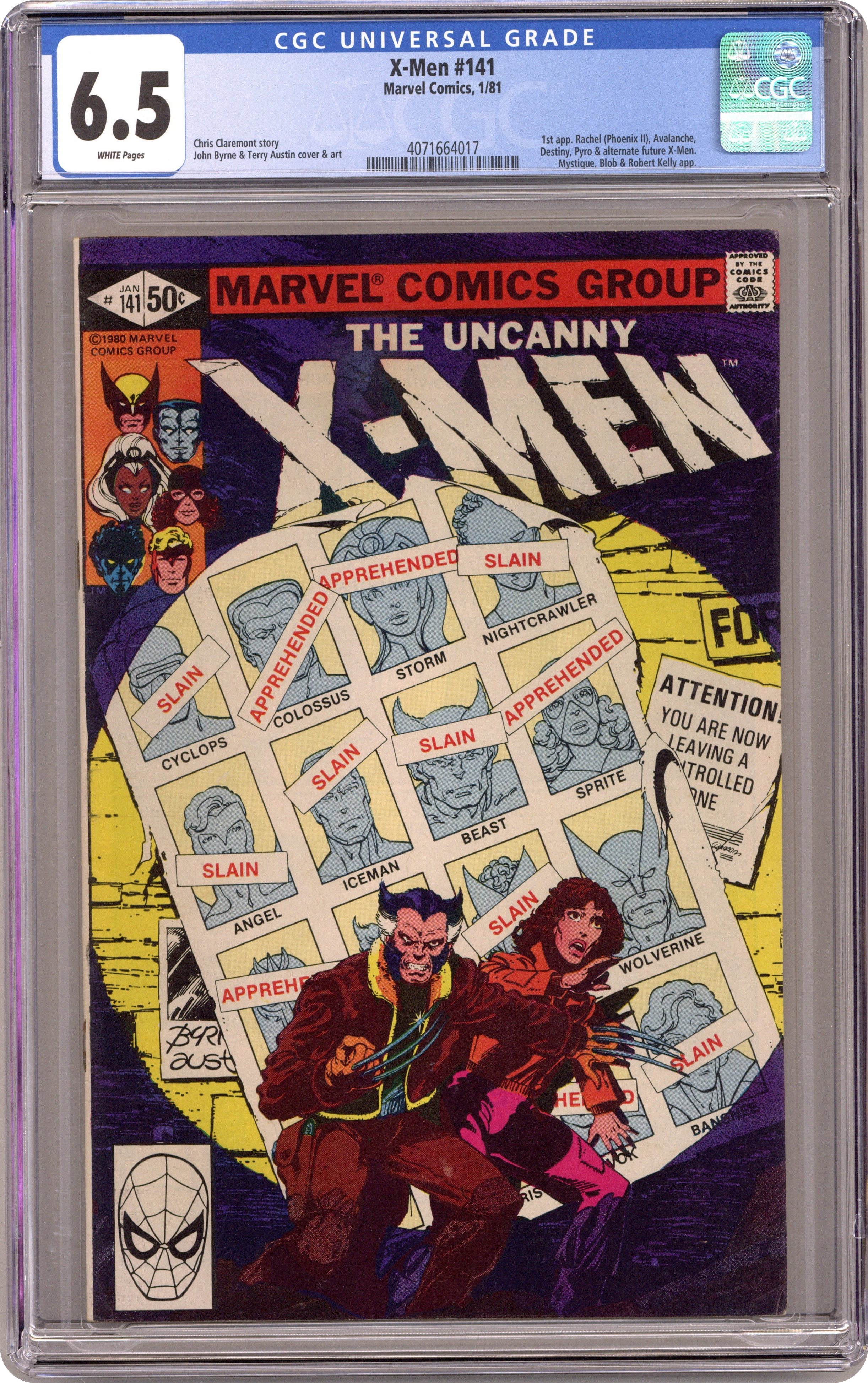 Direct Edition. Days of Future Past: Part 1 of 2. Story by Chris Claremont and John Byrne. Art by John Byrne and Terry Austin. The New Brotherhood of Evil Mutants set out to assassinate a prominent senator, and if the X-Men can't stop them the fate of mutantkind will be sealed. Get your first glimpse of the dystopian post-apocalyptic future that will come to pass if Xavier's dream dies. Welcome to "Days of Future Past!" NOTE: 1st appearances of Rachel Summers (Phoenix II), Senator Kelly, Mystique, Destiny, Avalanche, and Pyro. 36 pgs. Cover price $0.50. Grade: CGC 6.5 explanation of grade Condition: Used (collectible)