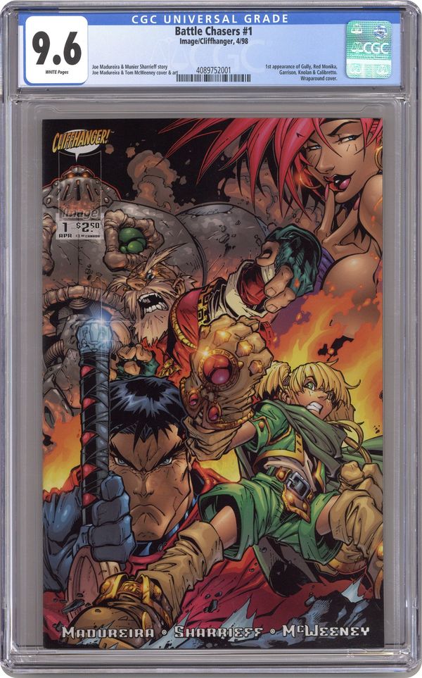 Wraparound Cover by Joe Madureira. Calibretto helps Gully protect a very special box, while Red Monika comes to Garrison with an offer in "The Most Dangerous Game." Story by Joe Madureira & Munier Sharrieff. Art by Joe Madureira & Tom McWeeney. Cover price $2.50. Grade: CGC 9.6 explanation of grade Condition: Used (collectible)