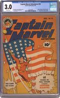 Ended Apr 16 2024 Winning Bid $330 Cover by C.C. Beck. Stories by Otto Binder, Al Liederman and unknown. Art by C.C. Beck, Al Liederman and unknown. After Billy escapes the ice trap, Captain Marvel tracks Mr. Mind to his secret moon base. The villain confronts Cap in several different forms (including his true appearance as a worm) but he escapes before Cap figures out which one was the true Mr. Mind in "The Monster Society of Evil Chapter 5: Marvel Meets Mr. Mind!" by Otto Binder and C.C. Beck. Plus: Billy visits Seattle, where Captain Marvel foils a plot to sabotage a war bond rally by taking the place of all the incapacitated performers in "Sabotage in Seattle!" with story by Otto Binder. Also: When the Switch brothers invent a way to change one's size, D.C. becomes a giant and decides to use his new size for criminal purposes while A.C. helps Captain Marvel to defeat his brother in "The Plundering Giant!" And: Billy is surprised when he meets his cousin Willard, who tells him that some crooks tried to swindle him when he arrived in town. Captain Marvel helps Willard stop the crooks, but it turns out that Willard isn't related to Billy after all in "His Country Cousin"! Also in this issue: Captain Kid..."Lights Up the Black Market!" by Al Liederman. And: 2-page text story "Sharks Below" by Ray Tender. 68 Pages, Full Color. Cover price $0.10. Grade: CGC 3.0 explanation of grade Condition: Used (collectible)