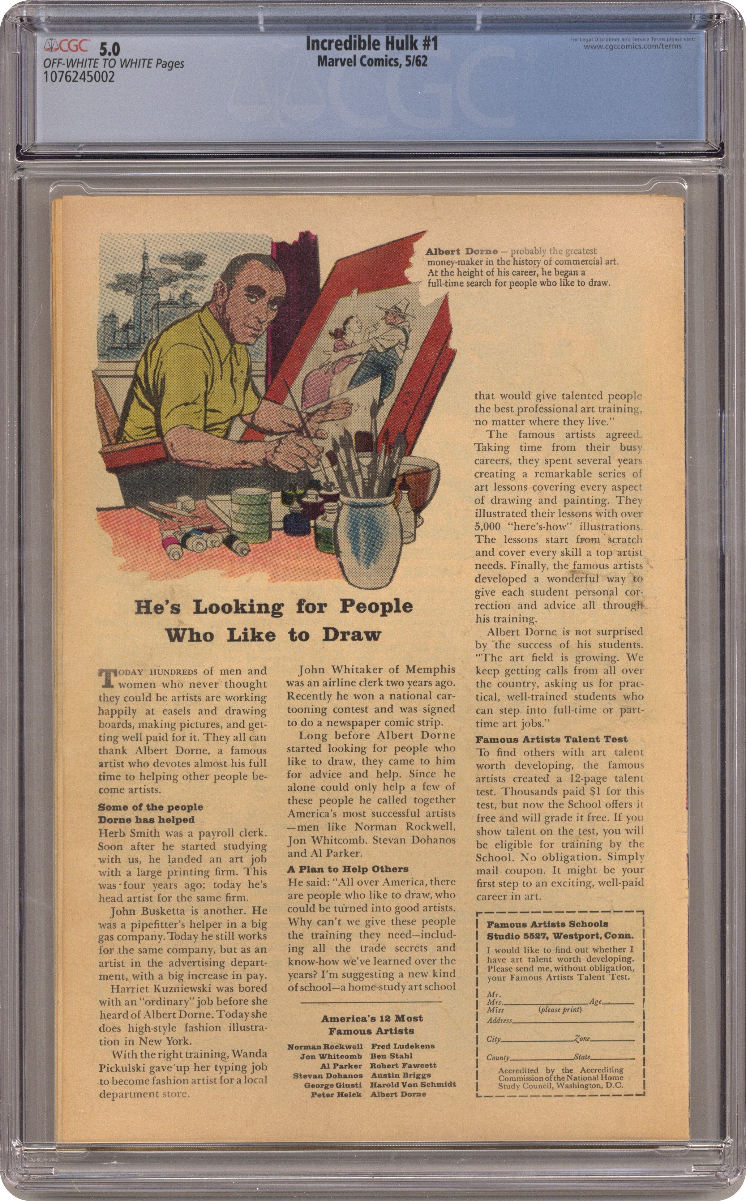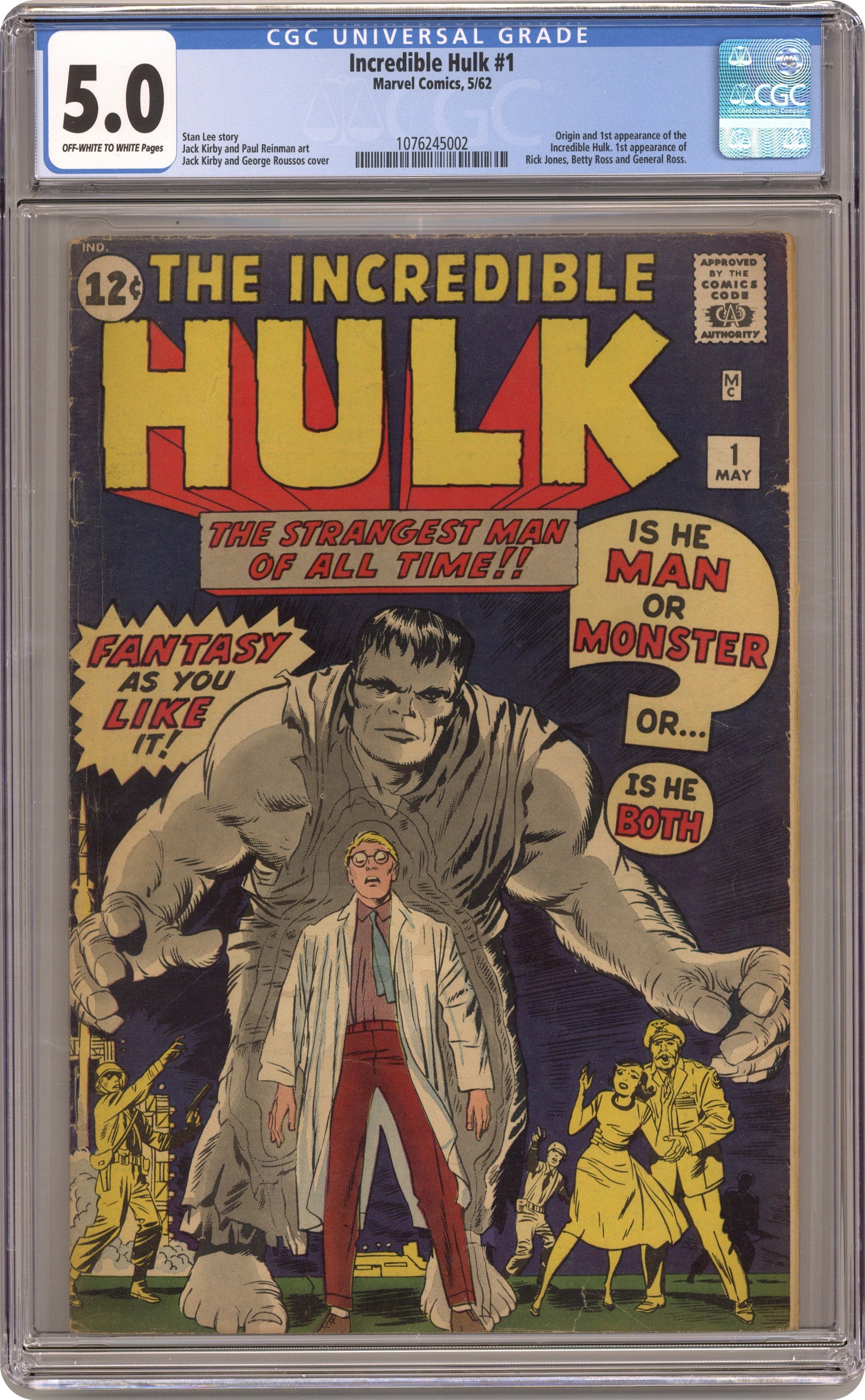 Ended Jul 21 2023 Winning Bid $33,988 The first appearance and origin of the Incredible Hulk in "The Coming of the Hulk." Script by Stan Lee, pencils by Jack Kirby, inks by Paul Reinman. 1st app. Rick Jones, General Ross, and Betty Ross. It's the height of the Cold War and the government is about to test their new Gamma Bomb. Unfortunately, a carefree and oblivious teenager named Rick Jones wanders out onto the test area. Dr. Bruce Banner, the creator of the Gamma Bomb, rushes out to warn the young man away. However, the bomb explodes and as Banner pushes the teenager to safety he is caught in the heart of a Gamma maelstrom. The gamma-rays that bombard Banner's thin frame transform his physiology. Now, whenever Banner becomes angry he transforms into the man-brute known as the Incredible Hulk. Feared by the public and hunted by the army, the Hulk becomes one of the most tragic figures in Marvel's history. General "Thunderbolt" Ross will not rest until the Hulk is destroyed. The creature's only allies are Rick Jones and Betty Ross, Thunderbolt's daughter and Banner's one true love. Thus begins the epic saga of the world's mightiest mortal. NOTE: Notice that the Hulk was colored grey for the first few issues of his series. In an interview, Stan Lee (creator) said very simply that the reason for this was that grey was the easiest color for the copiers of the time to print. When the technology got better the Hulk became green, and according to Stan, for no better reason than they didn't have a green hero in their stable yet. 36 pgs. Cover price $0.12. Grade: CGC 5.0 explanation of grade Condition: Used (collectible)