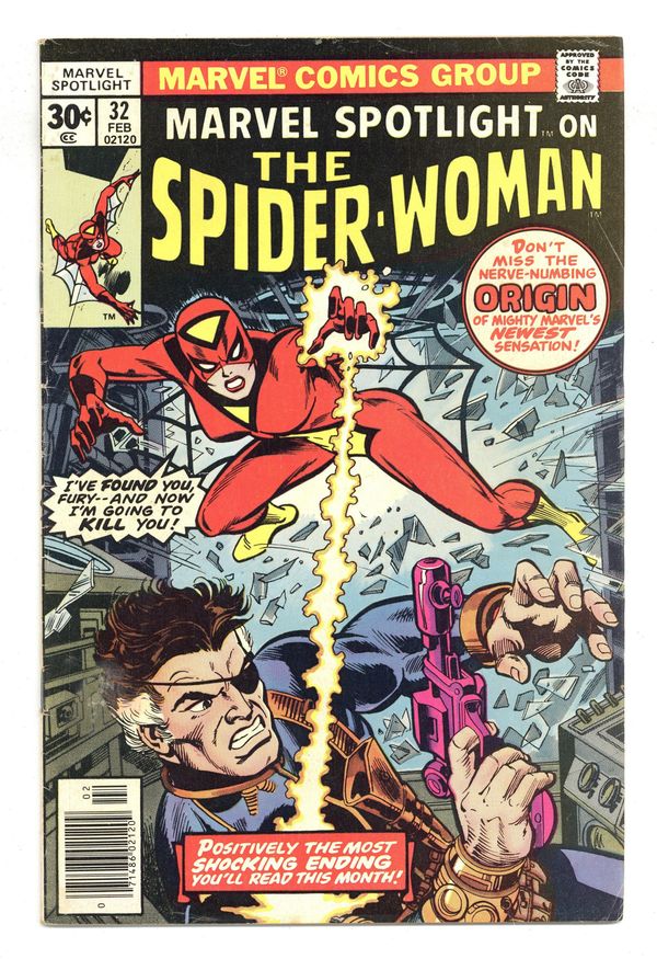 Ended Apr 8 2023 Winning Bid $78 Origin and 1st appearance of Spider-Woman. Cover pencils by Gil Kane and John Romita (alterations), inks by Dick Giordano (?) and John Romita (alterations). Dark Destiny!, script by Archie Goodwin, pencils by Sal Buscema (breakdowns) and Jim Mooney (finished art), inks by Jim Mooney; the mysterious Spider-Woman is tricked by Hydra into trying to kill Nick Fury. Continued in Spider-Woman #1. 36 pages, full color. Cover price $0.30. Grade: VG 4.0 explanation of grade Condition: Used (collectible)