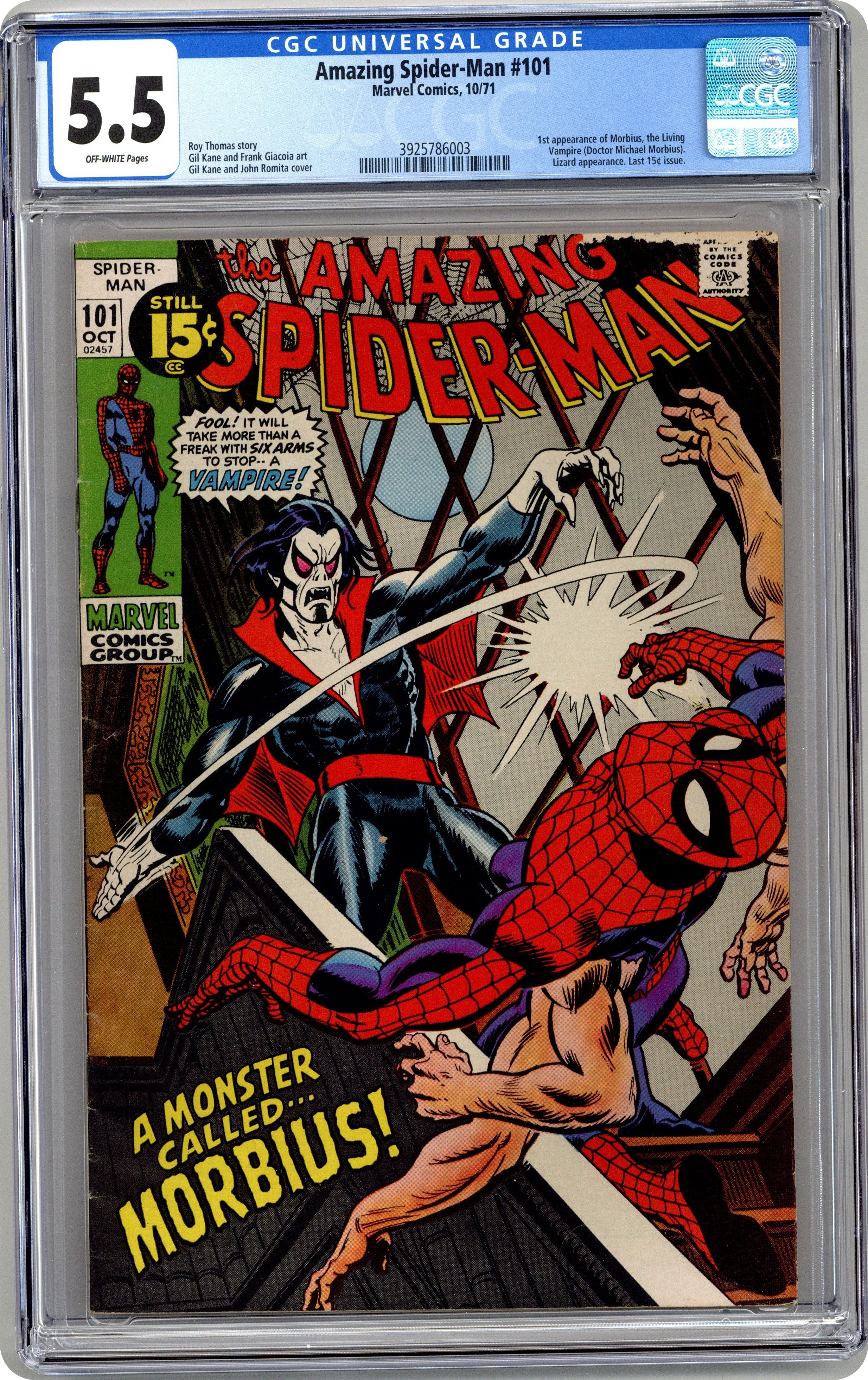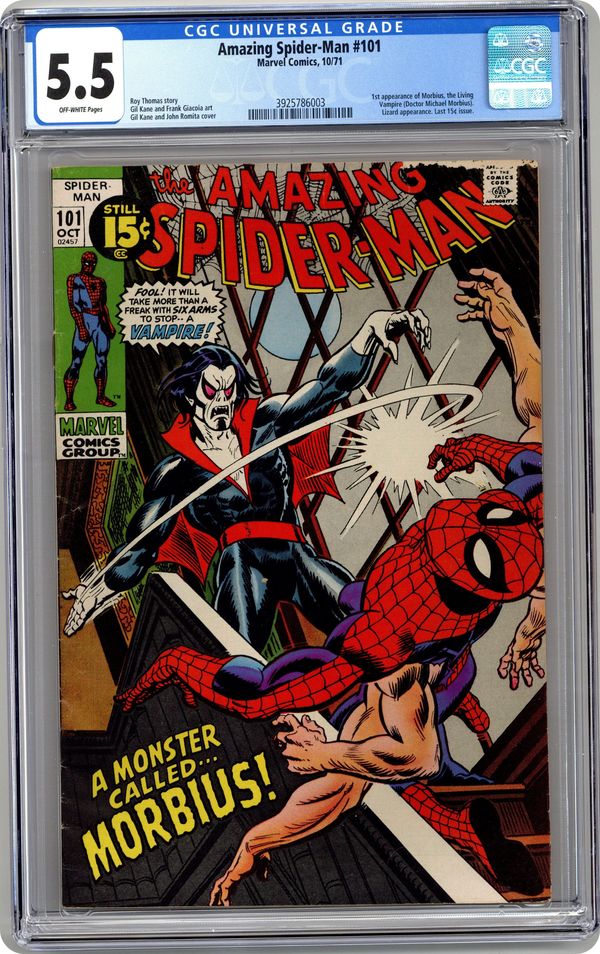 Ended Oct 15 2023 Winning Bid $275 First appearance of Morbius the Living Vampire in "A Monster Called Morbius!" Script by Roy Thomas. Pencils by Gil Kane. Inks by Frank Giacoia. Cover by Gil Kane and John Romita. The first 100 issues of the Amazing Spider-Man title are in the books! And the next chapter in the web-slinger's anthology kicks off with the debut of Marvel's first bronze age vampire: Morbius! However, at the moment Peter Parker has a much bigger problem on his (six) hands. After drinking the special potion he developed, Aunt May's nephew grew four additional arms! Oh, my goodness! Peter is desperate to find a way to remove the arms, so he calls Dr. Curt Connors for help. Dr. Connors has a summer house and laboratory in Southampton on Long Island...and he gives Spider-Man permission to stay there and work on a cure. Meanwhile, a strange, pale, and bloodthirsty man is the sole survivor of a shipwreck near Southampton. And he's looking for a quiet place to rest. Oh no. Is the six-armed Spider-Man on a collision course with a living vampire? Oh yes! Cameo appearances by Gwen Stacy, J. Jonah Jameson, Joe Robertson, and the Lizard. Last 15ยข cover price. (Notes: This is the first issue of the Amazing Spider-Man series not written by Stan Lee. There exists a second printing of this issue published in 1992 with a silver background cover. Marvel also published a facsimile edition of Amazing Spider-Man 101 in 2021.) 36 pages. Cover price $0.15. Grade: CGC 5.5 explanation of grade Condition: Used (collectible)