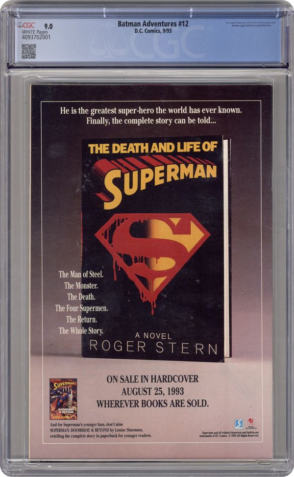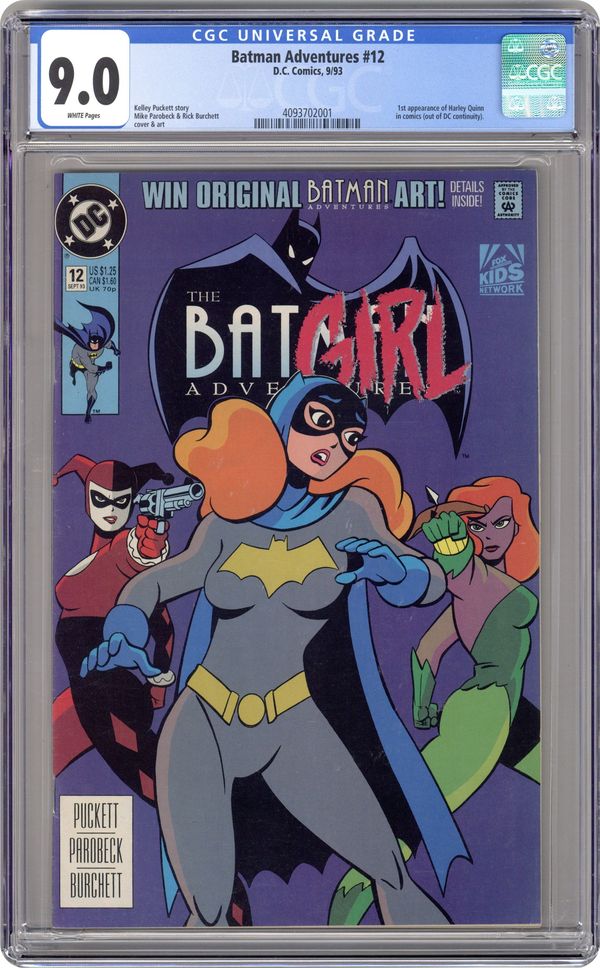 Direct Edition. 1st appearance of Harley Quinn in a comic book. "Batgirl: Day One." Barbara Gordon attends a costume party dressed as Batgirl. Unfortunately, Poison Ivy and Harley Quinn also decide to show up. Based on Batman The Animated Series. Script by Kelley Puckett, pencils by Mike Parobeck, inks by Rick Burchett. Cover by Parobeck. Cover price $1.25. Grade: CGC 9.0 explanation of grade Condition: Used (collectible)