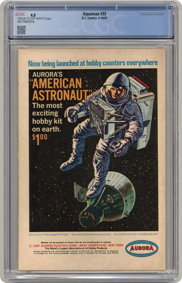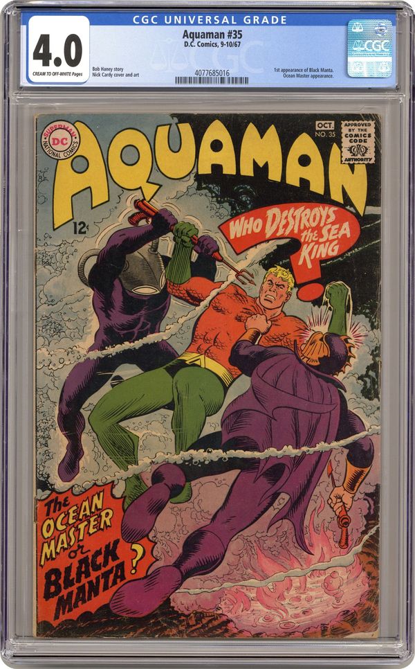 Cover art by Nick Cardy. Between Two Dooms!, script by Bob Haney, art by Nick Cardy; Black Manta attacks Atlantis. When he captures Aquaman, Ocean Master decides that nobody but him should defeat Aquaman and he attacks Black Manta, with Aquababy caught in the middle of the fight. Cap's Hobby Hints activity half-page by Henry Boltinoff. 36 pgs. $0.12. Cover price $0.12. Grade: CGC 4.0 explanation of grade Condition: Used (collectible)