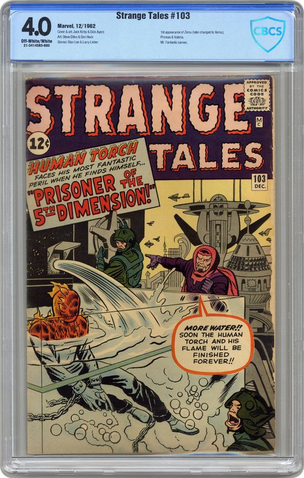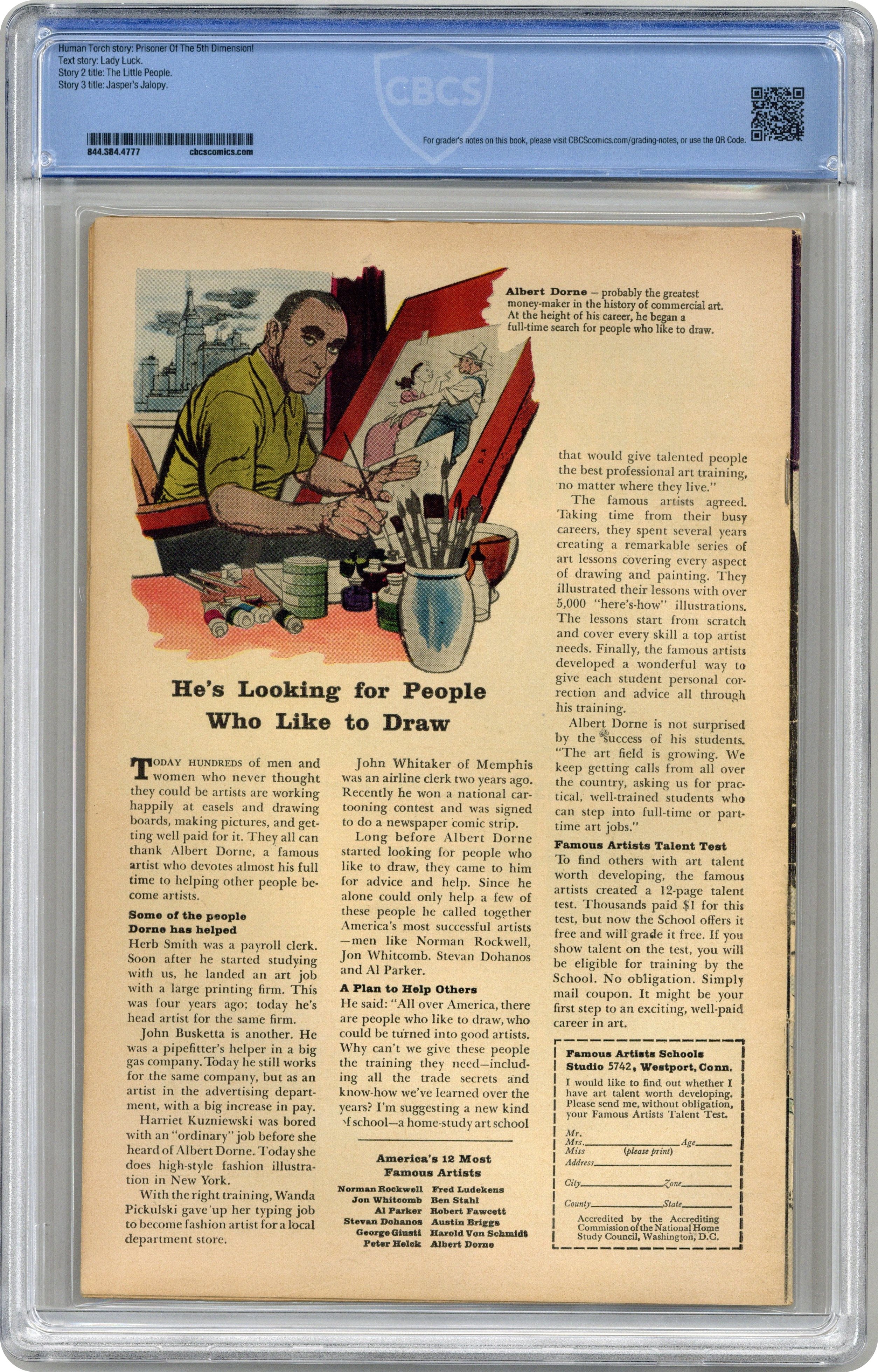 Cover pencils by Jack Kirby, inks by Dick Ayers. The Human Torch stars in "Prisoner of the 5th Dimension!" (and it's not referring to the sixties pop group!), script by Stan Lee (plot) and Larry Lieber (script), pencils by Jack Kirby, inks by Dick Ayers; The Human Torch discovers an impending invasion from the 5th Dimension, but he is captured by that dimensions tyrannical ruler; The Torch is freed by the tyrants opponents. "Lady Luck" text story. "The Little People!", script by Stan Lee (plot) and Larry Lieber (script), art by Don Heck; An American expatriate stumbles across tiny people in Europe who seem to recognize him; He is captured and escapes, thinking the experience was a dream, but wondering about reincarnation. "Jasper's Jalopy," script by Stan Lee, art by Steve Ditko; A man is mocked for keeping his old car, but it saves his life by sacrificing itself to keep him from crossing an unsafe bridge. 36 pgs., full color. Cover price $0.12. Grade: CBCS 4.0 explanation of grade Condition: Used (collectible)