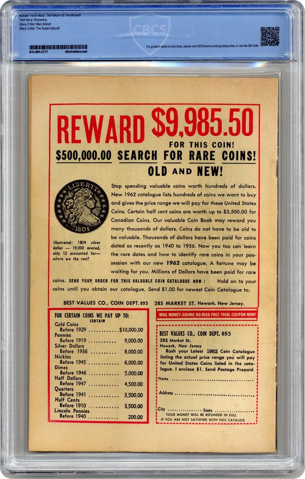 Ended Apr 10 2023 Winning Bid $100 Cover pencils by Jack Kirby, inks by Dick Ayers. The Human Torch stars in "The Return of the Wizard!", script by Stan Lee (plot) and Larry Lieber (script), pencils by Jack Kirby, inks by Dick Ayers; In prison, The Wizard becomes a model prisoner—just so he can become a trustee, work in the hospital, have access to chemicals...and break jail! "Discovery," art by Joe Maneely; A scrawny man is given a magic candy bar that confers great strength, but he discovers that he already possesses more strength than he suspects. "Man Alone!", script by Stan Lee (plot) and Larry Lieber (script), art by Don Heck; A man has recurring dreams of solitary confinement and goes to sea to escape this fate. He is shipwrecked and left alone on a desert island, unaware that this is the solitude he was destined for. "The Supernatural!", script by Stan Lee, art by Steve Ditko; A house appears to be magically dismantled by wisps of smoke, but it is only a girl playing with her dollhouse while her father smokes. 36 pgs., full color. Cover price $0.12. Grade: CBCS 4.0 explanation of grade Condition: Used (collectible)