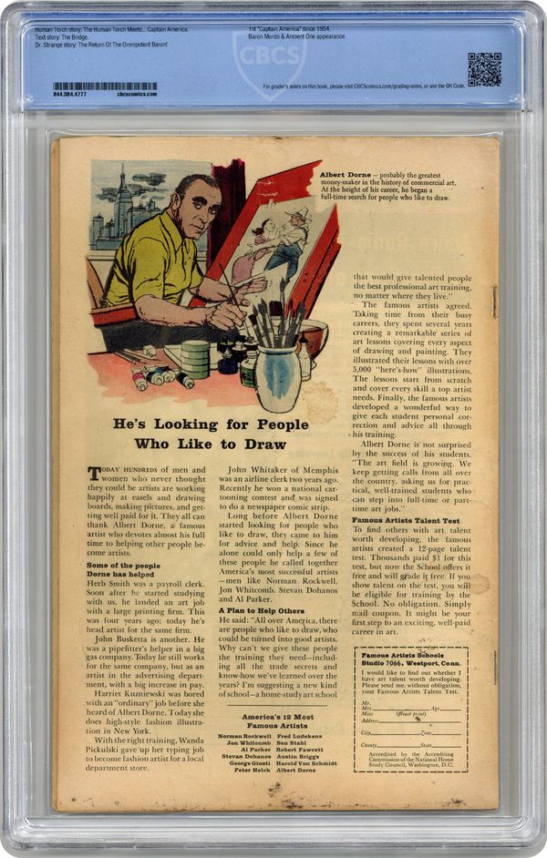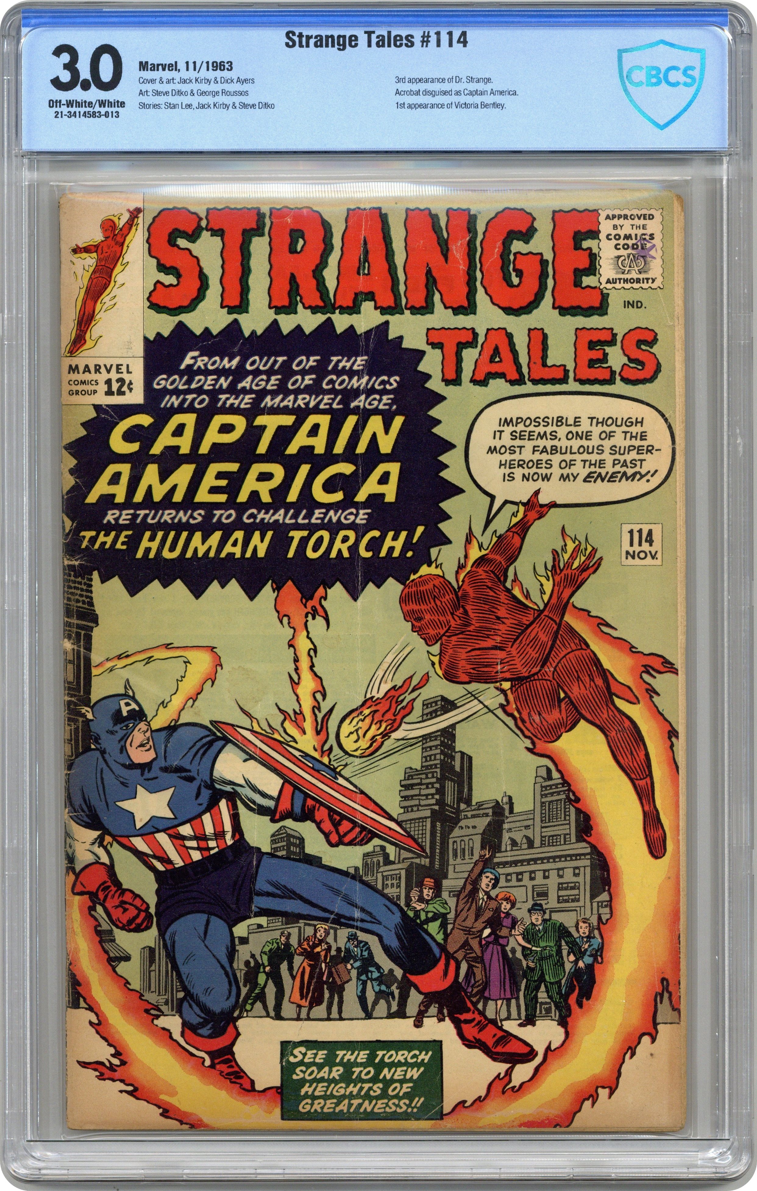 Ended Nov 15 2022 Winning Bid $130 Cover pencils by Jack Kirby, inks by Dick Ayers. "The Human Torch Meets... Captain America", script by Stan Lee (co-plot, dialogue) and Jack Kirby (co-plot, uncredited), pencils by Jack Kirby, inks by Dick Ayers; The Human Torch is upstaged by the return of Captain America, but the Torch realizes that it is his old enemy the Acrobat in disguise and defeats him; This is the first appearance of Captain America since the Golden Age (though it's actually the Acrobat from issue 106 disguised as the hero). "The Bridge" text story. Third appearance of Dr. Strange in "The Return of the Omnipotent Baron Mordo!", script by Stan Lee and Steve Ditko (co-plot), pencils by Steve Ditko, inks by George Roussos; Strange is lured into a trap in England by Baron Mordo, but defeats him with the help of a woman with latent magical talents; First appearance of Victoria Bentley. 36 pgs., full color. Cover price $0.12. Grade: CBCS 3.0 explanation of grade Condition: Used (collectible)