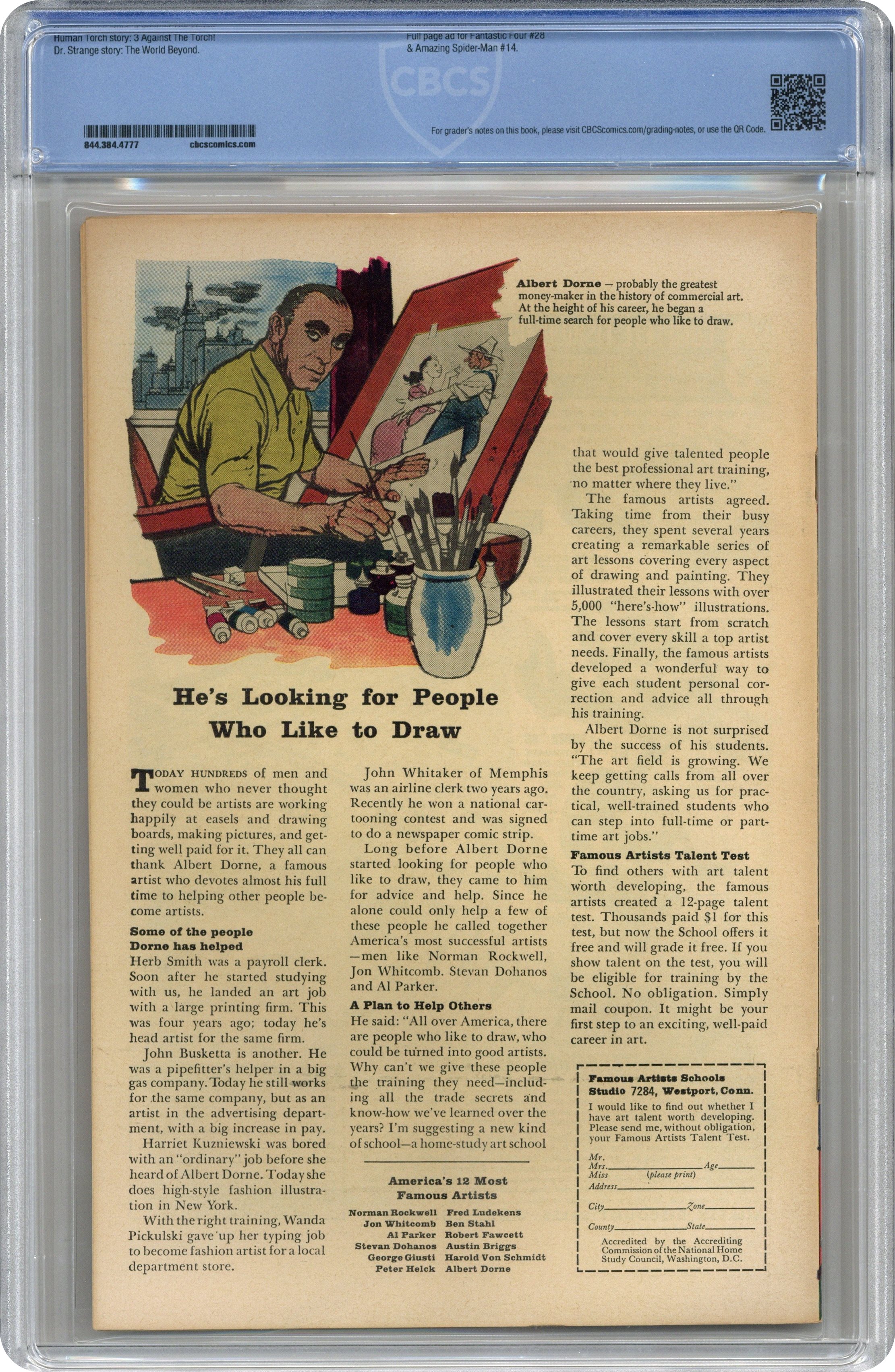 Ended Sep 12 2023 Winning Bid $101 Cover pencils by Jack Kirby and Steve Ditko (Doctor Strange), inks by George Roussos and Steve Ditko (Doctor Strange). The Human Torch mixes it up with Doctor Doom and his allies in "3 Against The Torch!", script by Stan Lee (co-plot, dialogue) and Dick Ayers (co-plot), pencils by Dick Ayers, inks by George Roussos (as George Bell); In flashback we see the how Dr. Doom used "The Terrible Trio" to trap the Fantastic Four, then discarded his underlings by sending them into another dimension!; With Doom gone, the three return to Earth, where they're foolish enough to try taking on The Torch again, figuring 3 against 1 would be no contest. "The World Beyond," script by Stan Lee and Steve Ditko (co-plot), pencils by Steve Ditko, inks by George Roussos; Weary from his struggles against supernatural forces, Strange falls asleep, carelessly forgetting to cast a protective spell over himself and becoming a prisoner of the Nightmare World!; Nightmare imprisons Strange, the only human who has ever defeated him, then says he's bored and looks forward to other victims; Strange summons The Gulgol, a creature that never sleeps. (Reprinted in Giant-Size Marvel Triple Action # 1.) "Strange Mission" text story. 36 pages, full color. Cover price $0.12. Grade: CBCS 6.5 explanation of grade Condition: Used (collectible)