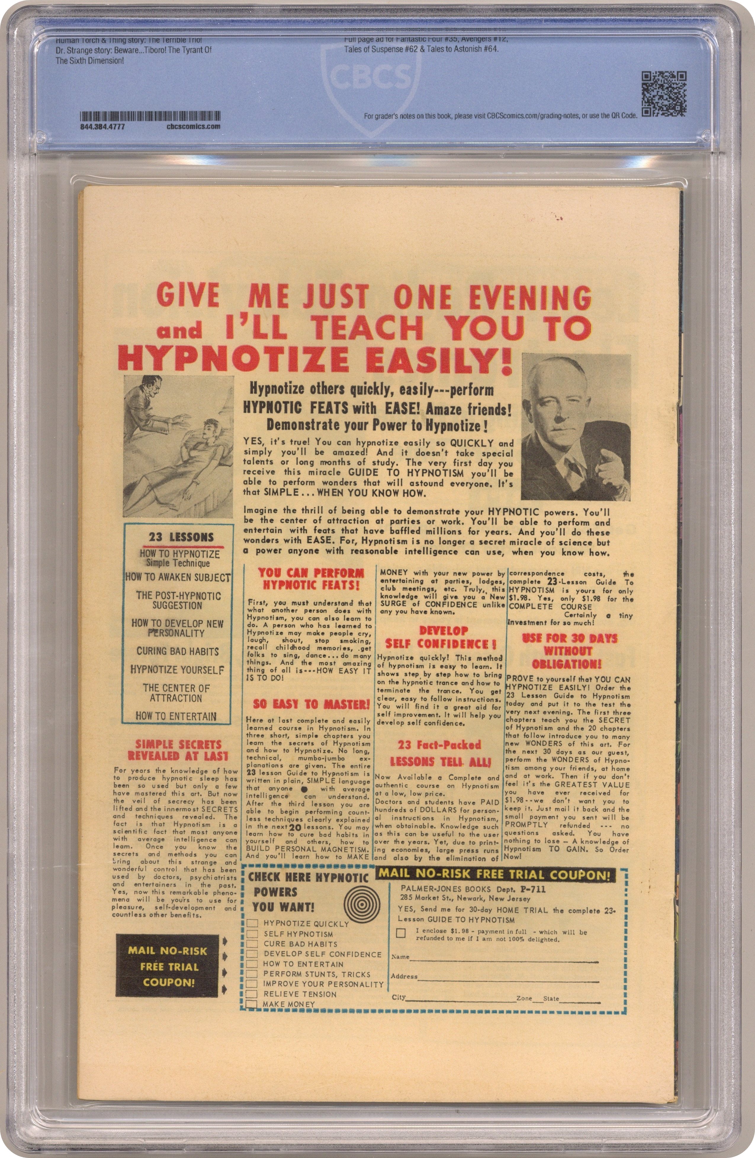 Ended Oct 16 2023 Winning Bid $70 Cover pencils by Jack Kirby, inks by Chic Stone. The Human Torch and the Thing star in "The Terrible Trio!", script by Stan Lee and Dick Ayers (co-plot), pencils by Dick Ayers, inks by Frank Giacoia (as Frankie Ray); On the golf course, Doris nags Johnny by comparing him to "gentlemanly" Peter Parker; When the latest emergency arises, she says a girl like her should have her head examined; Johnny falls into a trap of The Terrible Trio, but manages to send out a distress signal to Ben, who takes on these losers and saves Johnny's life in a railway yard. "Beware...Tiboro! The Tyrant of the Sixth Dimension!", script by Steve Ditko (plot) and Don Rico (script), art by Steve Ditko; A panel of three scientists appear on a TV program, rejecting Dr. Strange as an authority on the supernatural and dismiss magic as superstition; When the lights go out the men vanish and Dr. Strange is summoned; He discerns that the idol they dismissed is a gateway to the dimension of Tiboro, a powerful entity set to attack Earth; Strange travels to Tiboro's land and a fierce battle commences. 36 pgs., full color. Cover price $0.12. Grade: CBCS 8.0 explanation of grade Condition: Used (collectible)