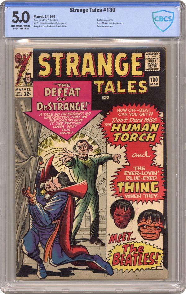Ended Feb 21 2023 Winning Bid $42 Cover pencils by Jack Kirby, inks by Chic Stone. The Beatles make a cameo appearance in "Meet the Beatles!" (What next, Sgt. Fury's Lonely Heart's Club Band?!?), script by Stan Lee (co-plot, dialogue) and Bob Powell (co-plot), pencils by Bob Powell, inks by Chic Stone; Ben and Johnny have another one of their "fights," then have to clean up Reed's lab as a result; They take Alicia and Doris on a double-date to see The Beatles, the girls getting to meet the rock stars in person and get autographs; but Ben & Johnny wind up having to go after some crooks who robbed the box-office; A wild free-for-all at Coney Island ensues; Sue Storm and Reed Richards cameo. "The Defeat of Dr. Strange," script by Steve Ditko (plot, uncredited) and Stan Lee (script), art by Steve Ditko; 1st appearance of Kaecilius, Dormammu agrees to give Mordo power without limit so that he may destroy Dr. Strange; In Tibet, Mordo and two followers attack; Strange manages to whisk his aging mentor to safety; As Strange leaves his mentor with a loyal hermit, Dormammu sends spirits to search for him. 1st app of Kaecilius. 36 pgs., full color. Cover price $0.12. Grade: CBCS 5.0 explanation of grade Condition: Used (collectible)