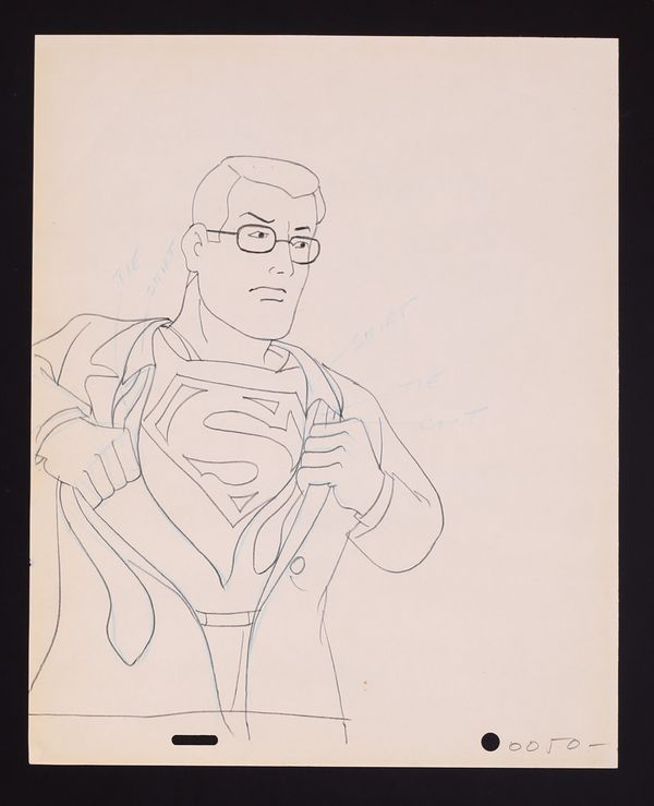 Original Production Sketch for The New Adventures of Superman (1966). A sketch likely used as the basis for a painted cel, this piece features Superman beginning to shed the guise of Clark Kent to spring into action. Blue line and standard pencil on trimmed animation paper. 8" x 10", B&W.