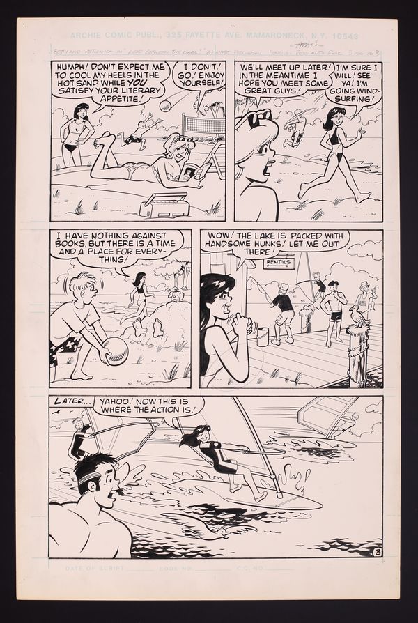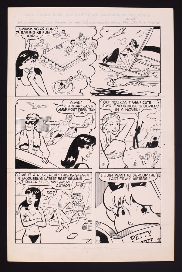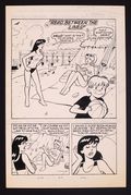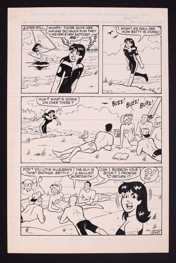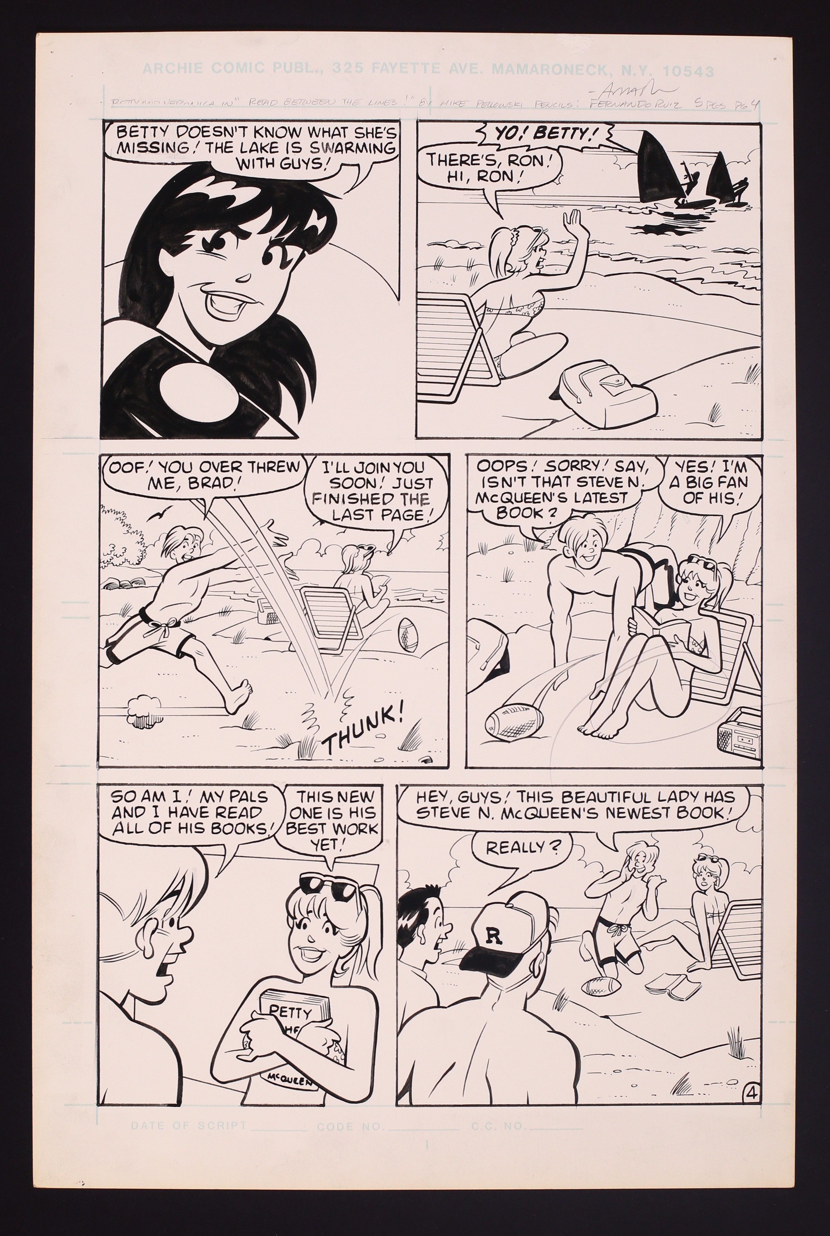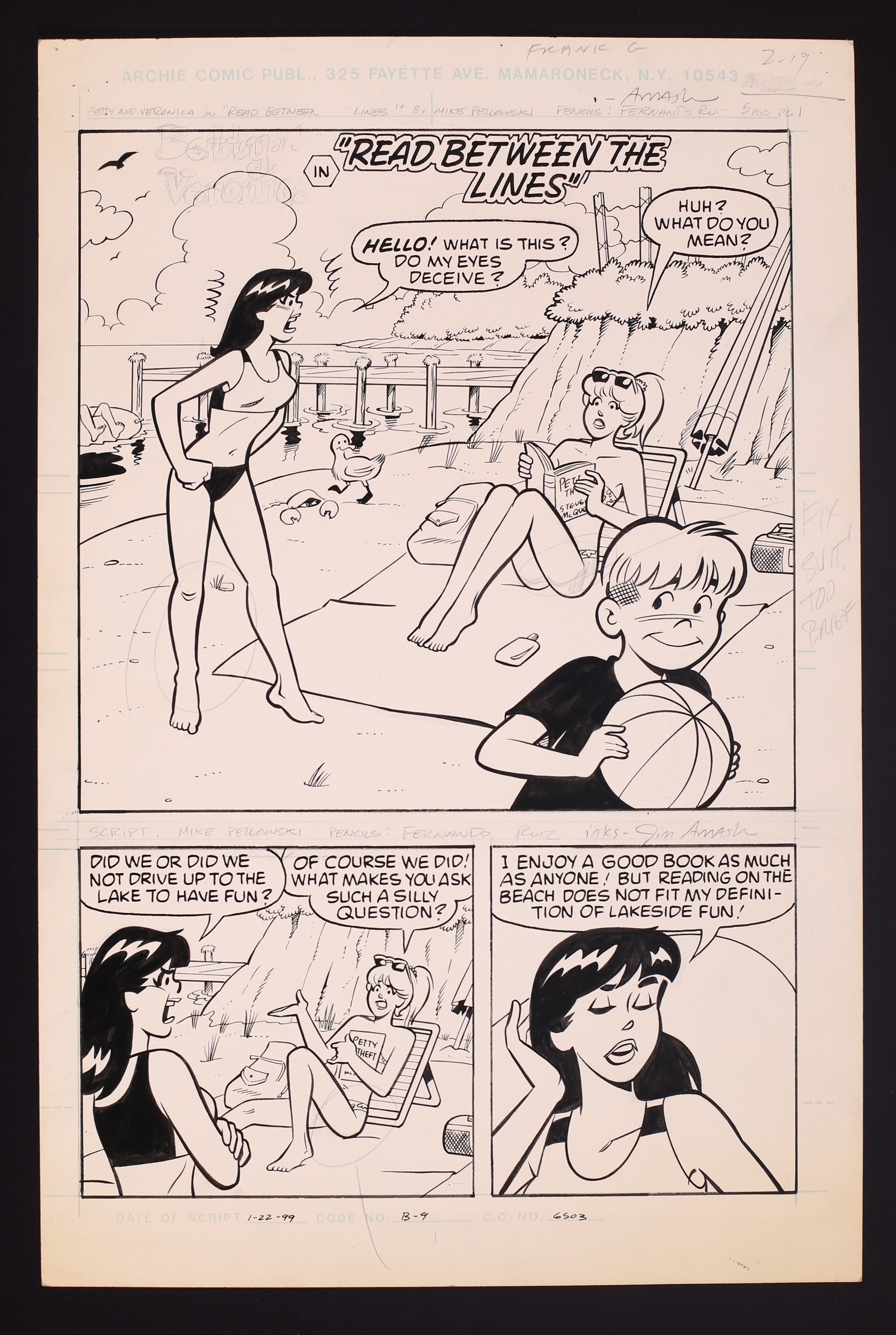 Original Art for the Complete 5-Page Story 'Read Between the Lines' from Betty and Veronica Double Digest #126 (2004) by Fernando Ruiz with inks by Jim Amash. This story finds the bikini-clad best-frenemies clashing over the best way to have fun at the beach- with surprising results! Also fun is the editor's note on the first page noting that Betty's bikini is too skimpy. Pencil and ink on Archie Comics art board. Each page is 11 1/2" x 17 1/2", B&W.