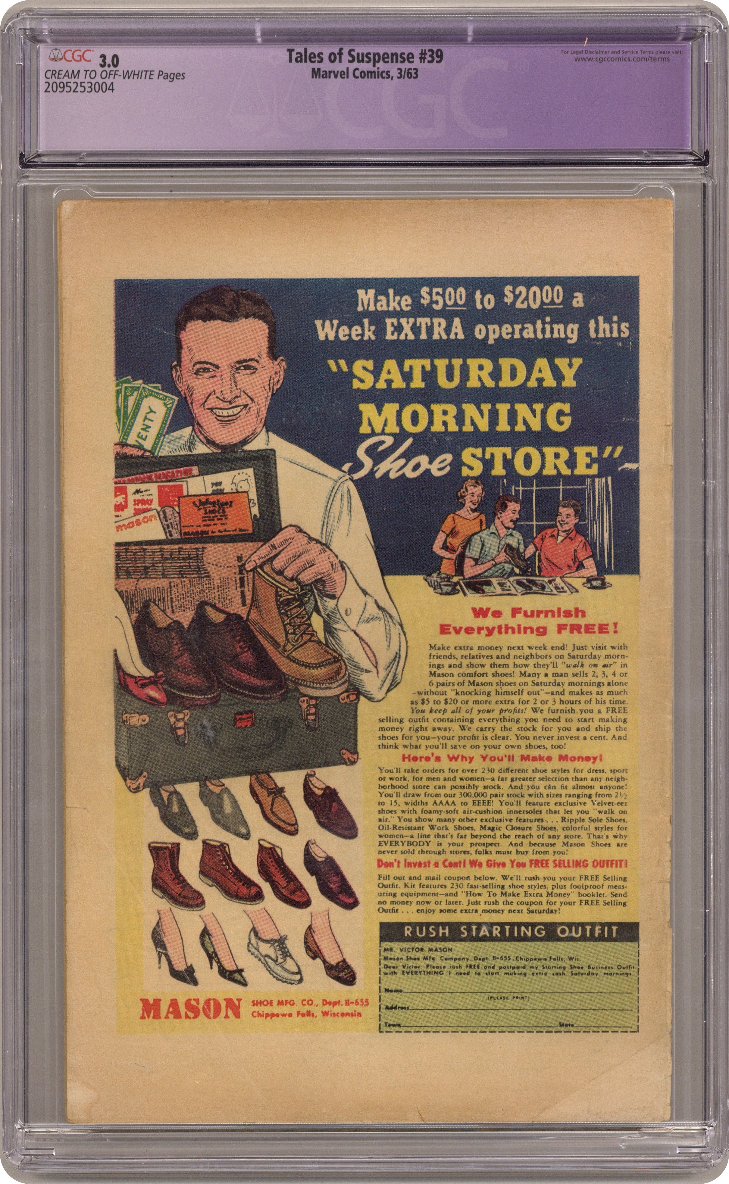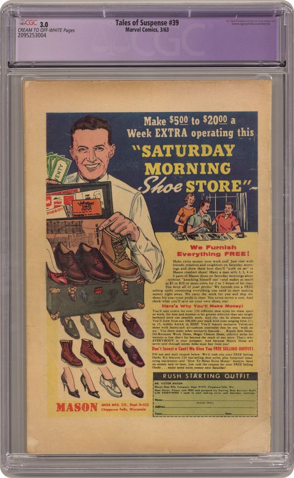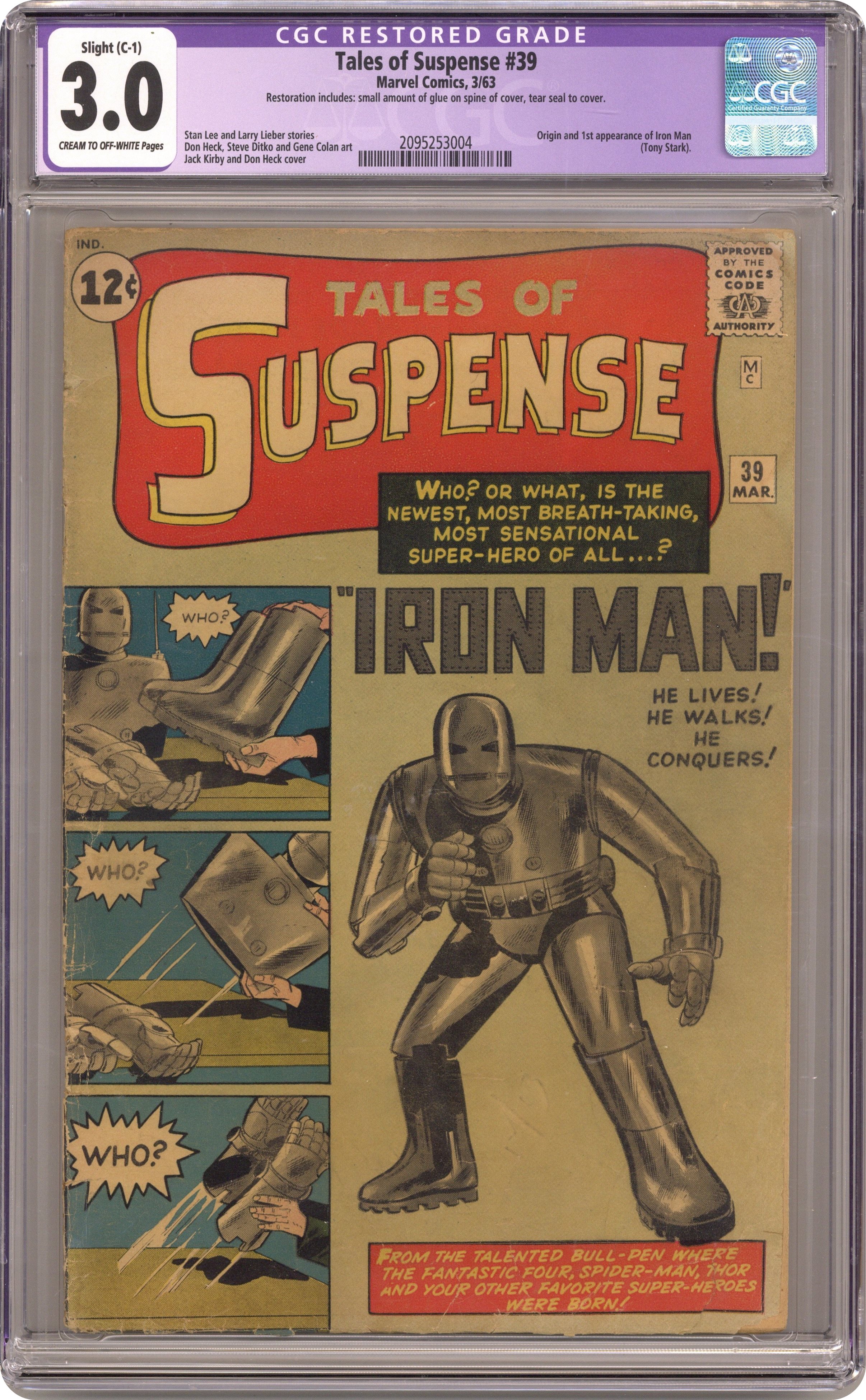 Cover pencils by Jack Kirby, inks by Don Heck. First appearance of Iron Man in "Iron Man Is Born!", script by Stan Lee (plot) and Larry Lieber (script), art by Don Heck; Playboy industrialist and weapons designer Tony Stark is injured in Vietnam and captured by communists; While pretending to build a weapon for his captors he builds a suit of battle armor to keep his injured heart beating and uses it to escape and beat the communist commander. "The Treasure" text story. "The Last Rocket!", art by Gene Colan; When the sun starts dying humanity goes into space, except for two nature lovers; Just as the last rocket leaves a new sun flares to life, and the two remaining humans, Adam and Eve, rename the planet Earth. "Gundar!", script by Stan Lee, art by Steve Ditko; A shipwrecked man finds cursed Viking ghosts on an island, and his descent from the captain that cursed them releases them. 36 pages, full color. Cover price $0.12. Grade: CGC 3.0 explanation of grade Condition: Used (collectible)