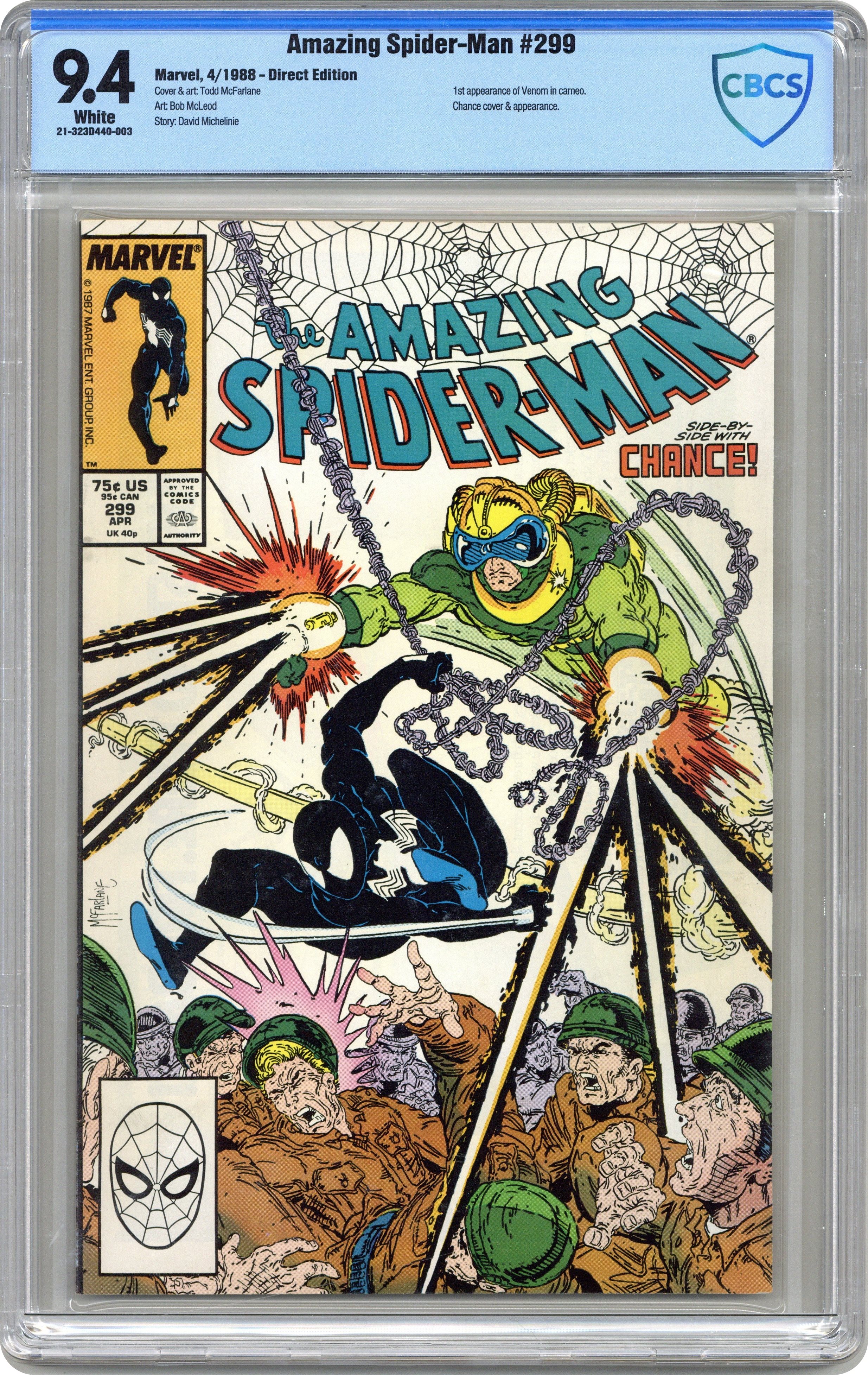 Ended Jul 28 2023 Winning Bid $78 Direct Edition. "Survival of the Hittist!" Part 2 of 2. Script by David Michelinie. Pencils by Todd McFarlane. Inks by Bob McLeod. Cover by Todd McFarlane. After their waterfront arms theft goes awry, the Life Foundation turns the tables on Chance! The mysterious survivalist group abducts the mercenary and takes him to their secret headquarters in northern New Jersey! But thanks to a well-placed spider tracer, the web-slinger infiltrates the foundation's secluded colony the next day...and rescues Chance! So now the adversaries of 24 hours ago suddenly become allies to avoid death...courtesy of the Life Foundation! First appearance (and cameo on the last page) by Venom. Cameo appearances by Eddie Murphy, Paul Schaffer, and Joe Robertson. Last 75ยข issue. 36 pages, full color. (Note: Chance returns in Amazing Spider-Man 336.) Cover price $0.75. Grade: CBCS 9.4 explanation of grade Condition: Used (collectible)