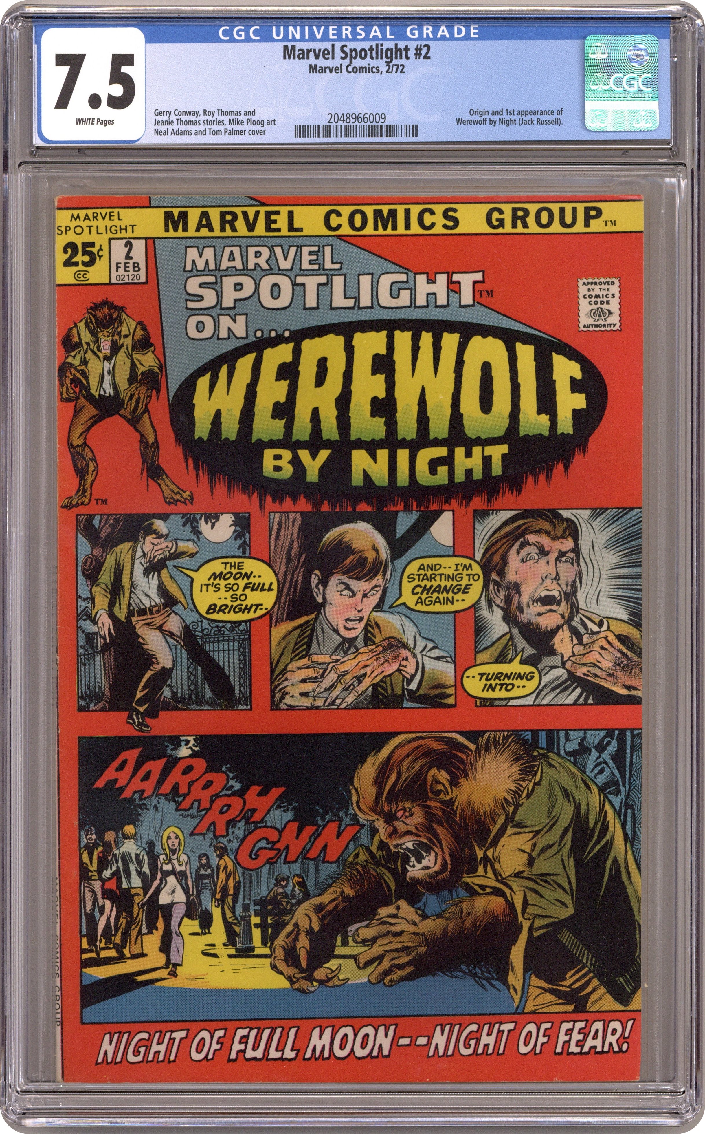 52-page giant. Origin and first appearance of Werewolf By Night. Cover pencils by Neal Adams, inks by Tom Palmer. First Night, script by Roy Thomas (plot); Jean Thomas (plot), and Gerry Conway (script), art by Mike Ploog; Jack learns of the family curse on his eighteenth birthday from his mother on her deathbead; Jack begins to believe that his step-father had his mother killed. House ad for Venus, art by Bill Everett. Where Gargoyles Dwell! starring Venus, script and art by Bill Everett. 52 pages, full color. Cover price $0.25. Grade: CGC 7.5 explanation of grade Condition: Used (collectible)