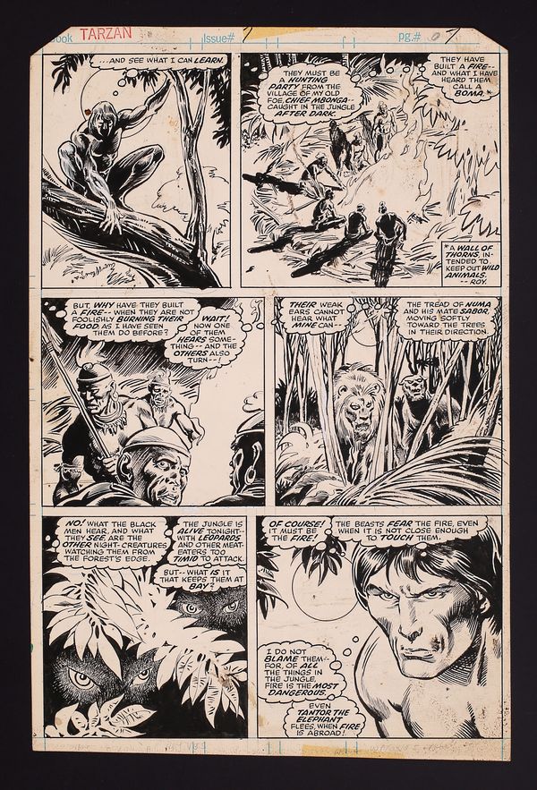 Original Art from Tarzan #7 (1977), Page 7 penciled by "Big" John Buscema with inks by Rudy Mesina. As Goro (the Moon) overtakes the jungle, Tarzan silently surveils a Gomangani hunting party- who themselves are being hunted by lions! A tense, moody page full of atmosphere, perfectly capturing the mystery and danger of the Tarzan's jungle!
