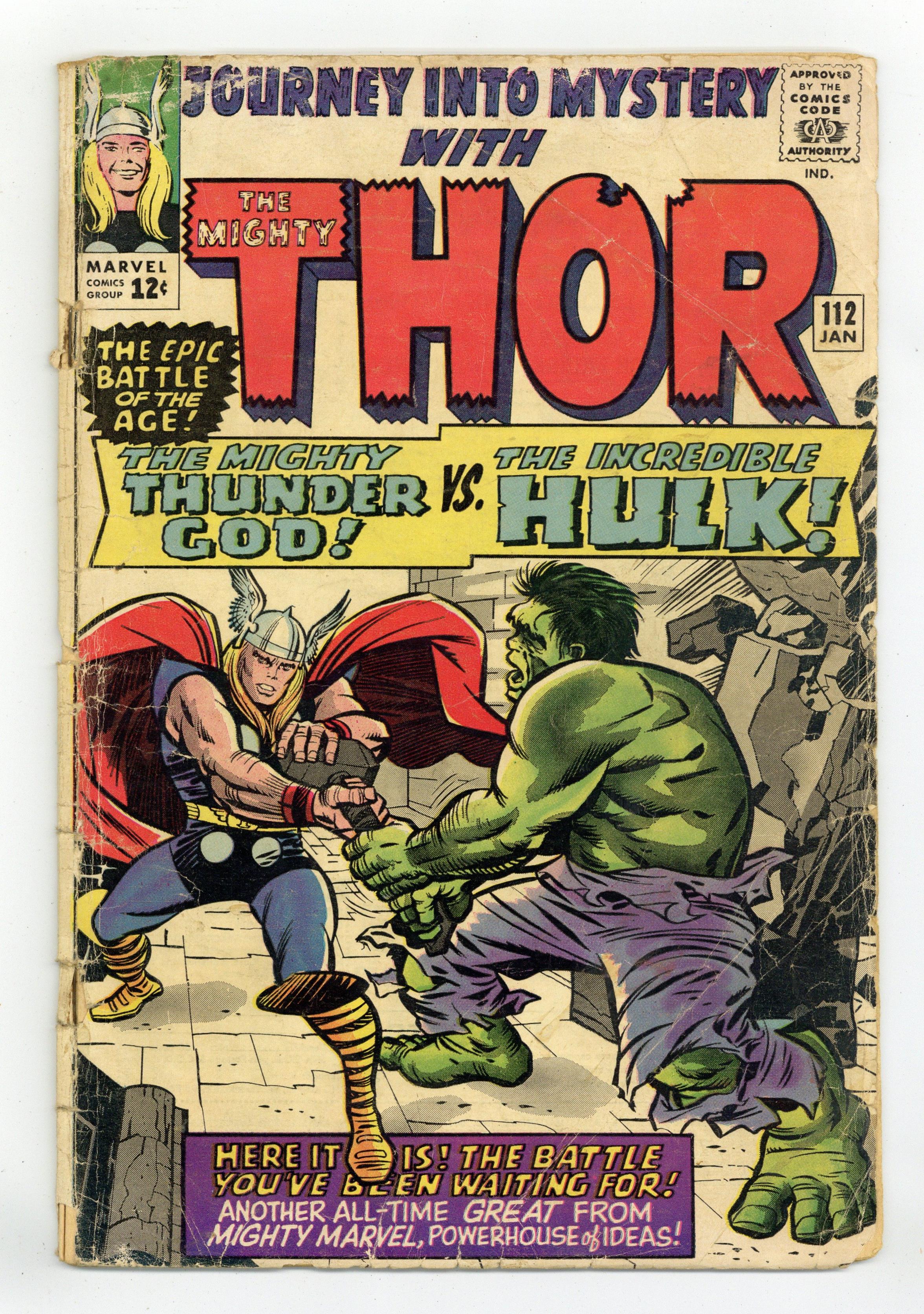 Cover pencils by Jack Kirby, inks by Chic Stone. "The Mighty Thor Battles the Incredible Hulk!", script by Stan Lee, pencils by Jack Kirby, inks by Chic Stone; Two rival fan clubs are debating who is stronger, Thor or the Hulk?; Thor happens to be passing by and drops in to offer his opinion; He relates the story of their epic battle (in Avengers #3) and describes a previously unseen scene in which he and the Hulk tussle; He goes into deep thought and when pressed, cannot say who is the stronger because he has insufficient proof!; Guest appearances by the Avengers (Iron Man, the Sub-Mariner, Giant-Man, and the Wasp) and Odin. "Tales of Asgard" back-up: "The Coming of Loki!", script by Stan Lee, pencils by Jack Kirby, inks by Vince Colletta; The Asgardians battle the Giants. Laufey, King of the Giants of Jotenheim, is slain; A bundle of cloth is found. It contains a baby; Odin adopts the child and names him Loki. The Merry Marvel Marching Society promo. 36 pgs., full color. Cover price $0.12. Grade: GD- 1.8 explanation of grade Condition: Used (collectible)