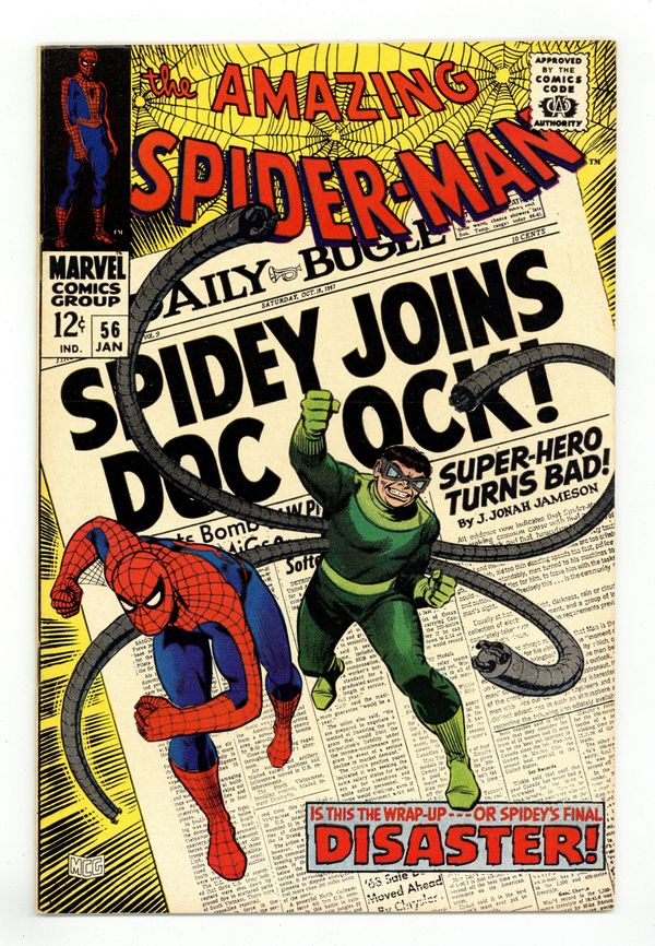 Doctor Octopus appearance and the first appearance of Capt. Stacy in "Disaster" script by Stan Lee, pencils by John Romita Sr., inks by Mike Esposito as "Mickey Demeo." Spidey has amnesia, and Doc Ock convinces him that they are partners! Will he fall for it? Or just go along until his memory comes back? Romita cover. Reprinted in Marvel Tales # 41. 36 pgs. Cover price $0.12. Grade: FN+ 6.5 explanation of grade Condition: Used (collectible)