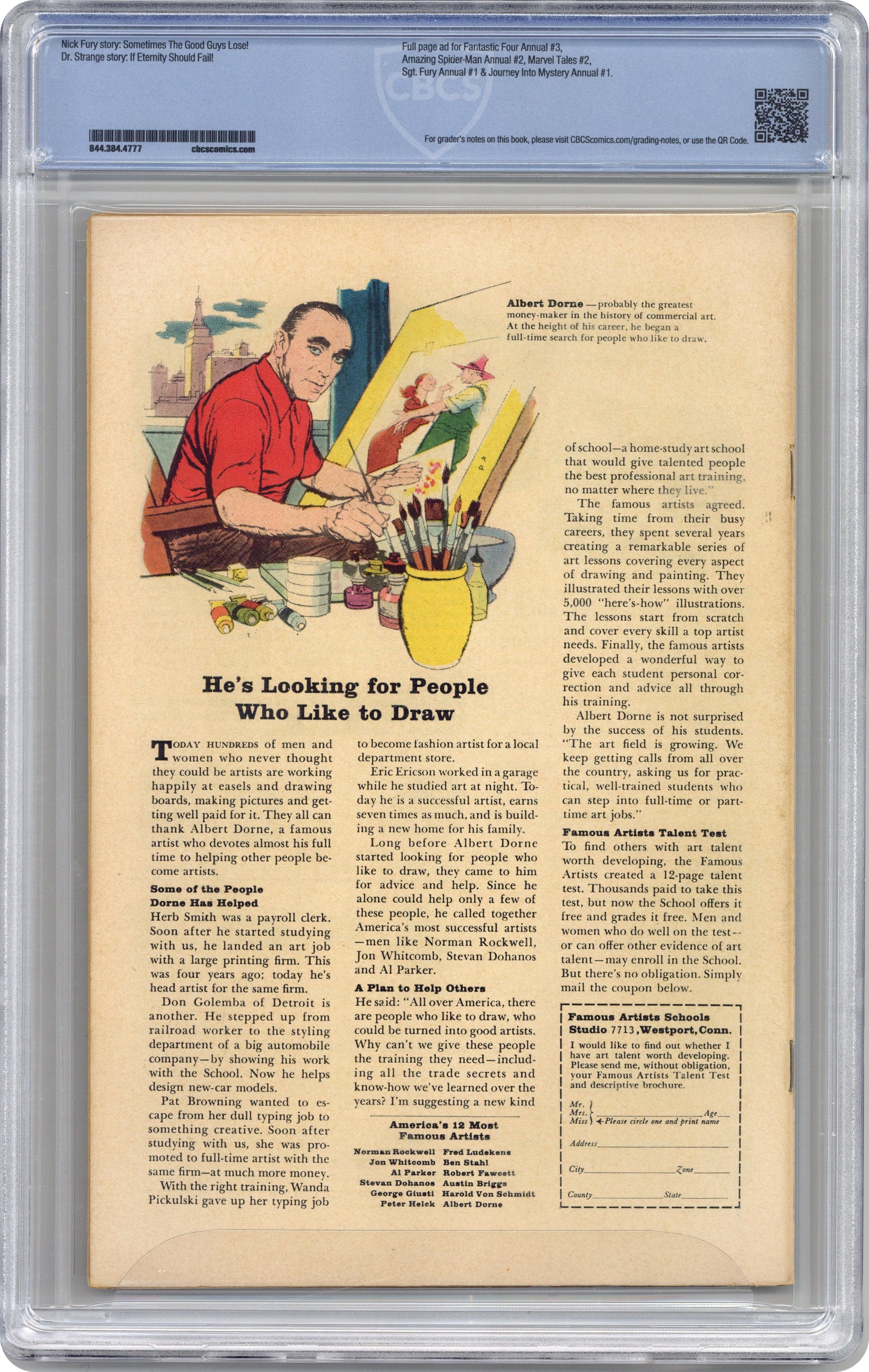 Ended Jul 24 2023 Winning Bid $68 Cover pencils by Jack Kirby, inks by John Severin. "Sometimes the Good Guys Lose!", script by Stan Lee and Jack Kirby (co-plot), pencils by Jack Kirby (layouts) and John Severin, inks by John Severin; Aboard SHIELD's Intercontinental Ballistic Plane Fury uses the Televiewer Tube to locate the Betraton Bomb launch site; It is destroyed but the bomb was already launched; Agent G unsuccessfully implores her father, Imperial Hydra to come to his senses; He sends HYDRA's Fox Division to deliver his terms to every nation on Earth; Tony Stark prepares to show Fury the Braino-Saur,a new weapon when HYDRA agents capture him. "If Eternity Should Fail!", script by Steve Ditko (plot) and Stan Lee (dialogue), art by Steve Ditko; In another dimension that defies description, Dr. Strange comes face-to-face with Eternity, who learns that Strange is indeed worthy of The Ancient One's trust; He knows that if Mordo & Dormammu are not stopped, all mankind will be in jeopardy; But after all Strange has been through, Eternity tells him he already has the power he needs; First appearance of Eternity; Appearance by Clea. 36 pgs., full color. Cover price $0.12. Grade: CBCS 7.0 explanation of grade Condition: Used (collectible)