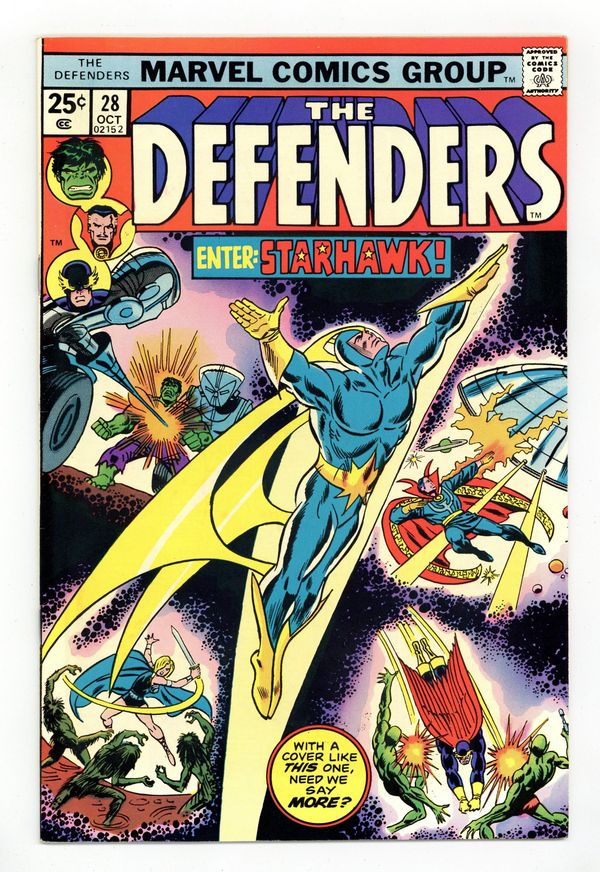 Cover pencils by Ron Wilson, inks by Frank Giacoia. First full appearance of Starhawk in My Mother, The Badoon!, script by Steve Gerber, pencils by Sal Buscema (layouts/breakdowns), Frank Giacoia (Finished Art), and John Tartaglione [as John Tartag] (Finished Art), inks by Frank Giacoia and John Tartaglione [as John Tartag]; Nighthawk, Charlie-27 and Martinex are captured by the Badoon; Starhawk helps Vance Astro and Valkyrie return to Earth; Hulk and Yondu are forced to enter the Super-Death Sweepstakes. 36 pgs. $0.25. Cover price $0.25. Grade: VF+ 8.5 explanation of grade Condition: Used (collectible)