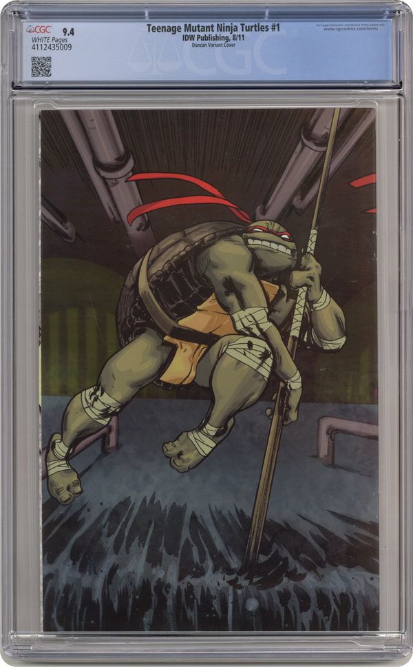 Limited 1 for 20 Retailer Incentive Gatefold Cover by Dan Duncan. Kevin Eastman, Tom Waltz (w) o Dan Duncan (a) Sam Kieth, Duncan x 4 (c) They're BACK! This summer, the original heroes in a half-shell make a triumphant return to comics! Leonardo, Donatello, Michaelangelo, and Raphael reunite to bring their ninja aptitude and teenage attitude to IDW Publishing in this all-new, action-packed series. Featuring a cast of familiar characters-Master Splinter, April O'Neill, Casey Jones, and more-and true to the spirit of the original comics created by Kevin Eastman and Peter Laird, the TEENAGE MUTANT NINJA TURTLES are bigger and badder than ever, and ready to rock old and new fans alike! Cover price $3.99. Grade: CGC 9.4 explanation of grade Condition: Used (collectible)