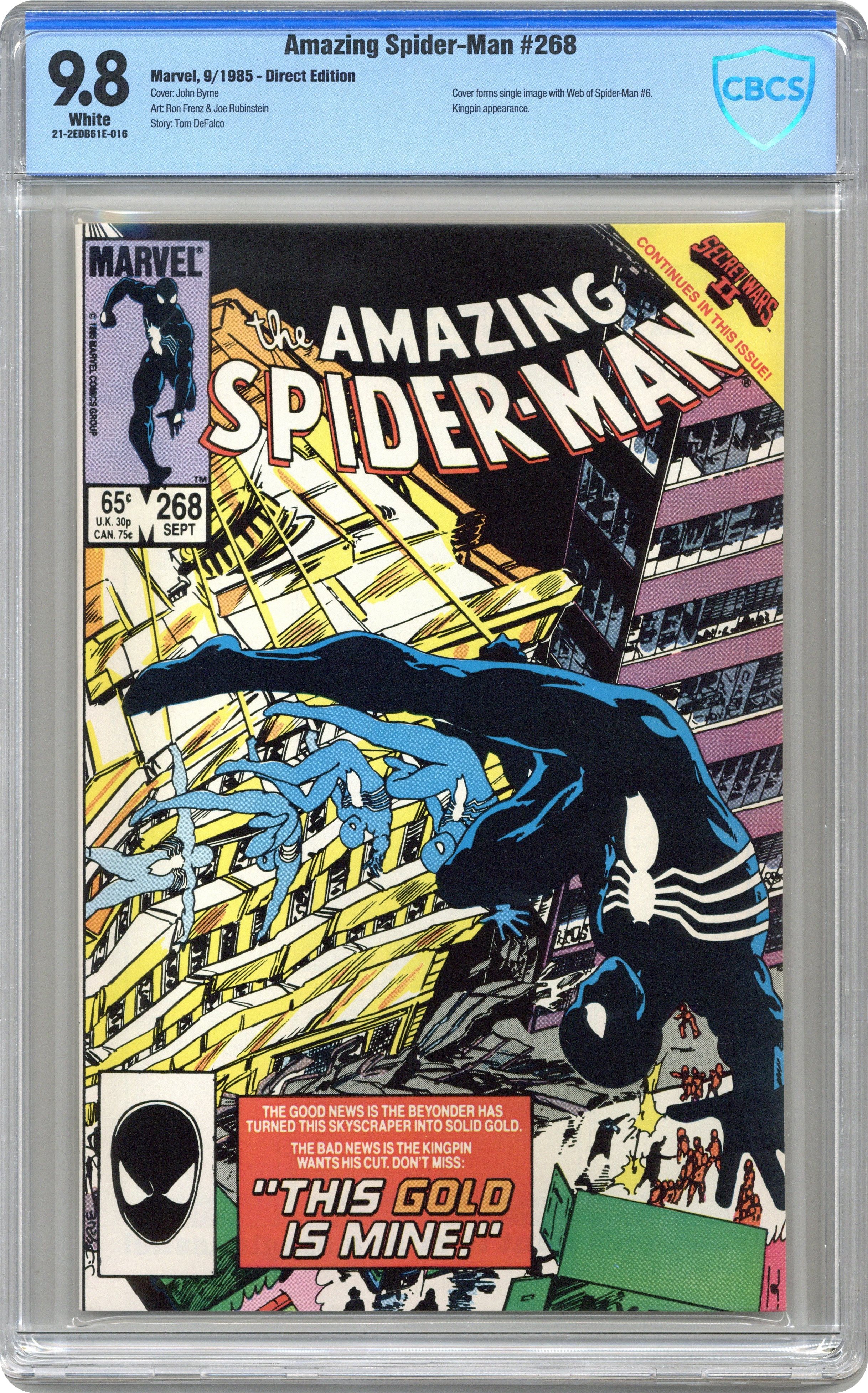 Ended Oct 19 2023 Winning Bid $51 "This Gold is Mine!" Secret Wars II crossover. Part 2 of 2. Script by Tom DeFalco. Pencils by Ron Frenz. Inks by Joe Rubinstein. Cover by John Byrne. Story continues from Web of Spider-Man 6. In incredible fashion the Beyonder turned Power Man and Iron Fist's office building into gold! Everyone will be rich! But hold on...the world's financial markets will collapse with tons of gold dumped into the global economy! So, it's the federal government to the rescue! Under the wall-crawler's watchful eye, the military transports the gold to the west side docks and loads it on cargo ships bound for the Great Puerto Rican trench! However the Kingpin of Crime wants his cut of the gold! So, the Arranger and his henchmen hijack one of the ships! Will Spider-Man make the big city pirates walk the plank? Cameo appearances by J. Jonah Jameson, Ned Leeds, Joe Robertson, and Firelord. (Notes: The cover of this issue can be paired with the cover of Web of Spider-Man 6 to form a complete image of the office building turned into gold. Avengers 258 offers a preview of the web-slinger's upcoming battle vs. Firelord. This issue was reprinted in Marvel Tales 278.) 36 pages. Cover price $0.65. Grade: CBCS 9.8 explanation of grade Condition: Used (collectible)