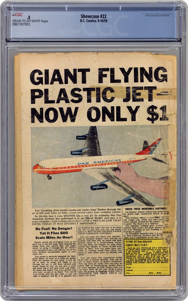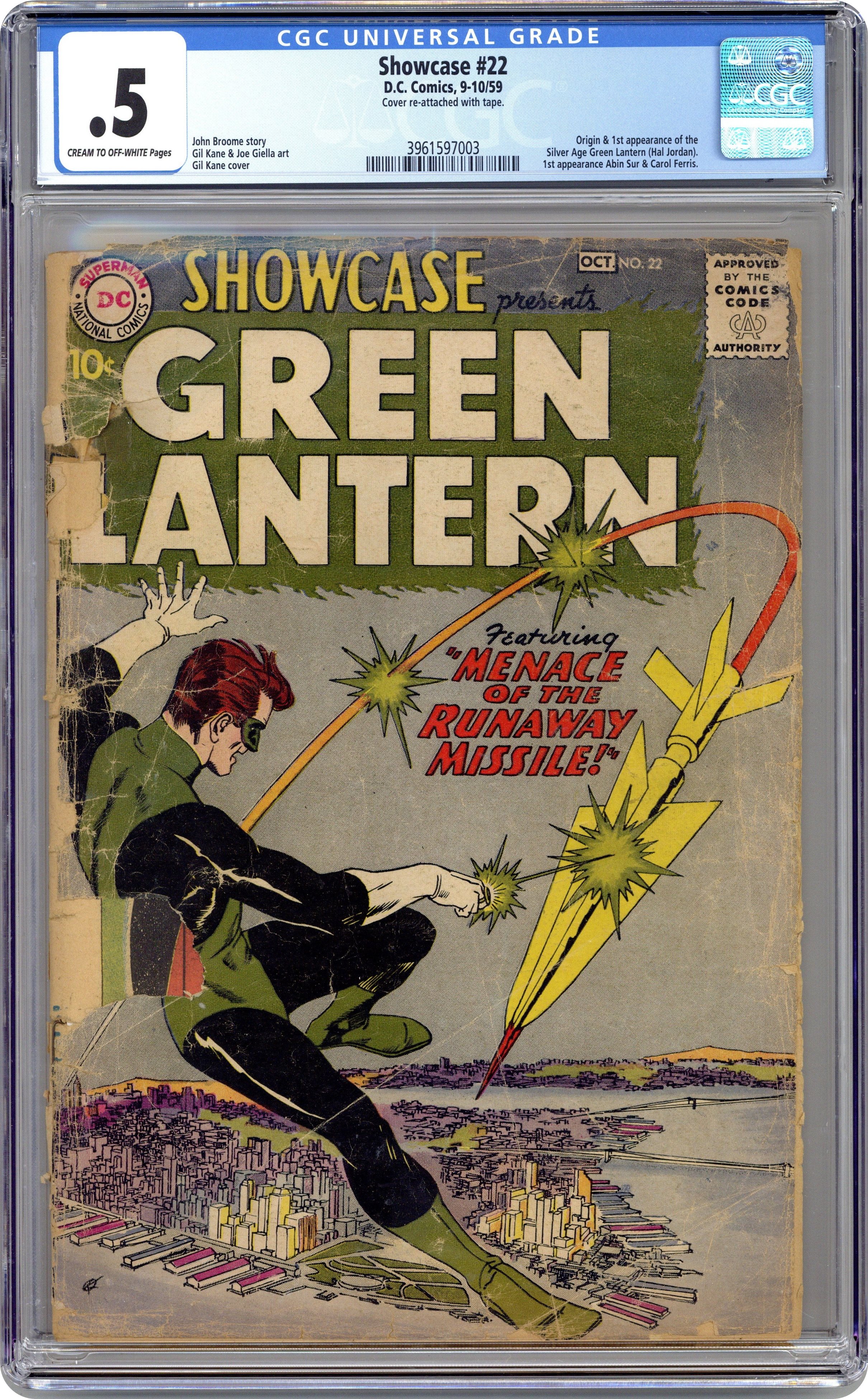 Ended Apr 14 2023 Winning Bid $1,255 Origin and 1st appearance of Hal Jordan (Silver Age Green Lantern). Cover and interior art by Gil Kane. SOS Green Lantern; Hal Jordan is selected by the power ring of Abin Sur to become a Green Lantern. Secret of the Flaming Spear!; Saboteurs try to crash a new experimental aircraft created by Ferris Aircraft. Menace of the Runaway Missile!; Green Lantern stops a missile launched by Dr. Parris at a government Hydrogen Power facility. Scripts by John Broome. 36 Pages, Full Color. Cover price $0.10. Grade: CGC 0.5 explanation of grade Condition: Used (collectible)