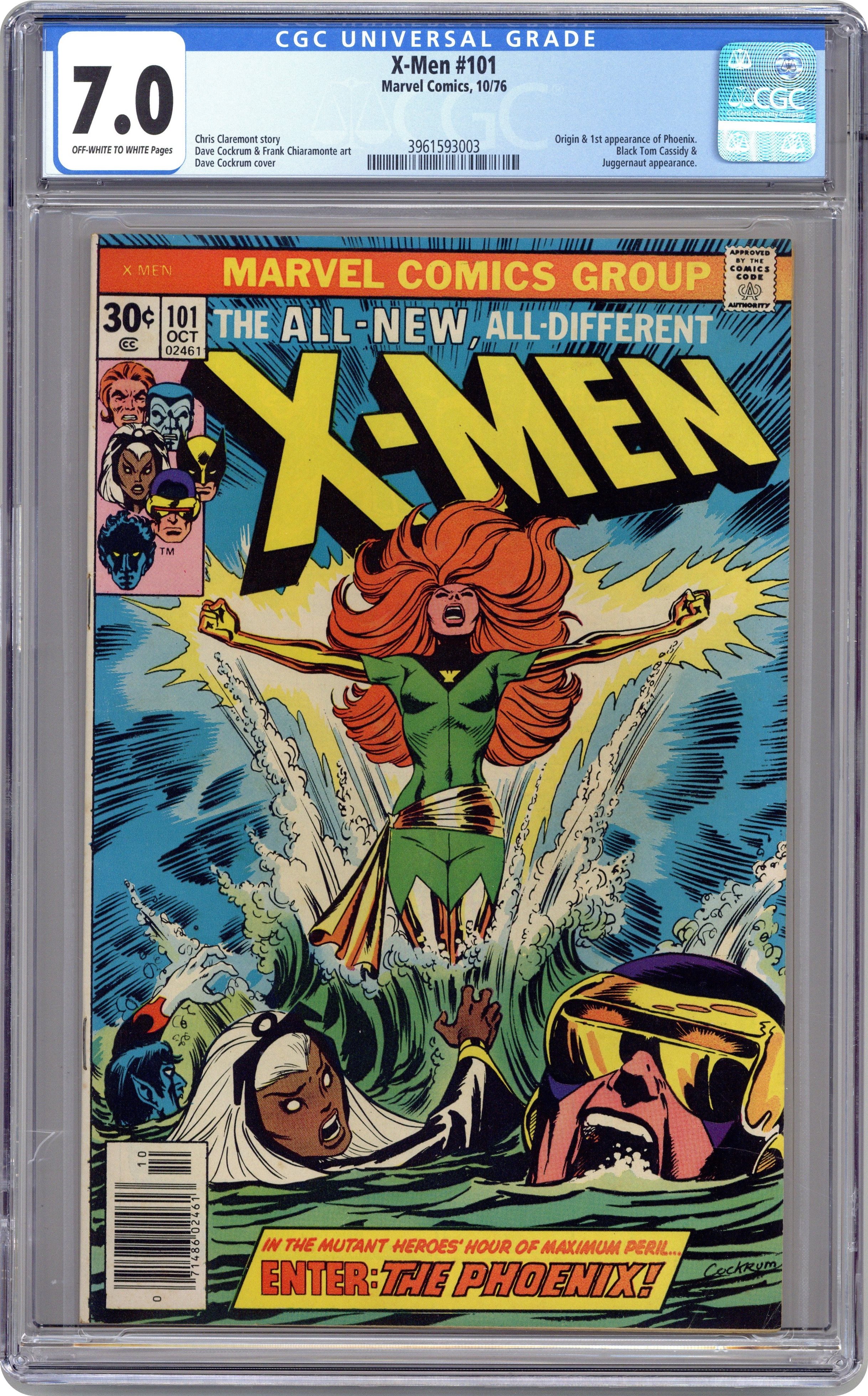 Ended Oct 27 2025 Bid History 15 bids Winning Bid $403 "Like a Phoenix, from the Ashes!" Part 1 of 3. Story by Chris Claremont. Art by Dave Cockrum and Frank Chiaramonte. In the startling aftermath of last issue's events, the X-Men crash-land back on Earth, but they soon learn that a unbelievable change has come over Jean Grey. Don't miss the rise of the Phoenix! Meanwhile, the team decides to take in some much needed R&R. They head to Ireland to Banshee's ancestral home. However, nothing but danger and death wait for them here. 36 pages, full color. NOTE: 1st appearance of Phoenix, 1st appearance of Black Tom Cassidy, and Juggernaut cameo. Cover price $0.30. Grade: CGC 7.0 explanation of grade Condition: Used (collectible)