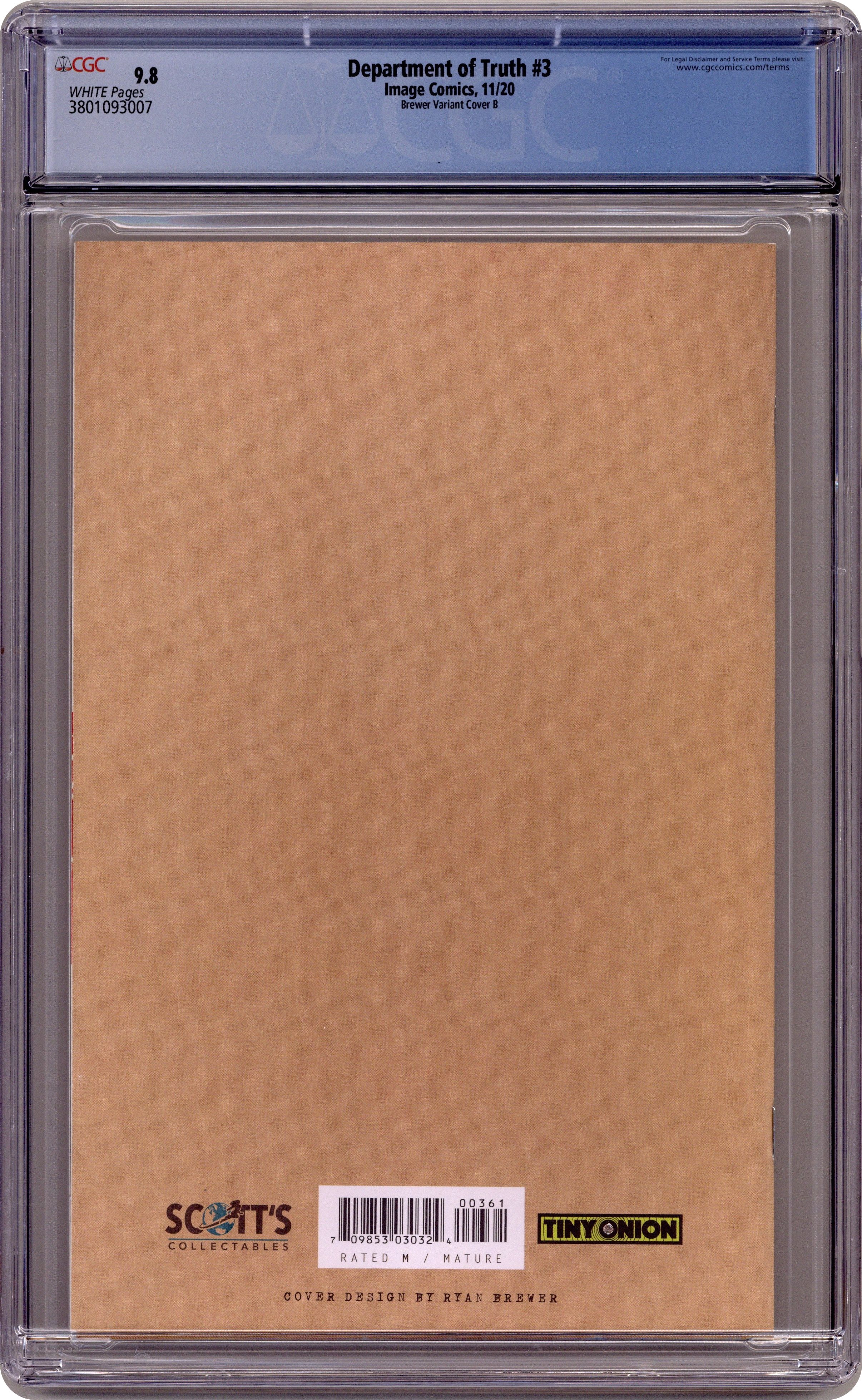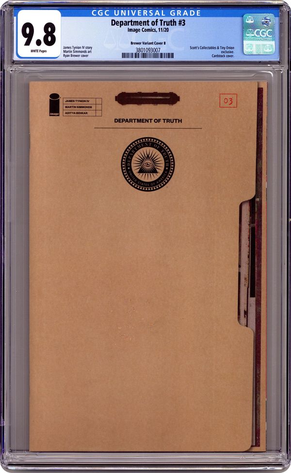 Scott's Collectibles and Tiny Onion exclusive cardstock cover by Bryan Brewer. Written by James Tynion IV. Art by Martin Simmonds. Mary never knew what 'false flag' or 'crisis actor' meant, until her son was murdered in a mass shooting, and the threats and accusations began. But as her reality starts to bend around her, it's the job of the Department of Truth to keep these dark conspiracies from coming true…at any cost. JAMES TYNION IV (Batman) & MARTIN SIMMONDS (Dying is Easy) continue their breakout thriller. 28 pages, full color. Rated M Grade: CGC 9.8 explanation of grade Condition: Used (collectible)