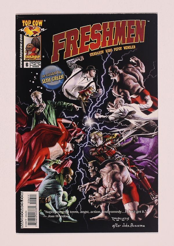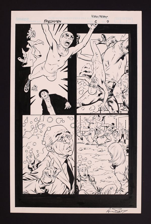 Original Art from Freshmen #6 (2006 Top Cow), Page 9 Pencils by Leonard Kirk with Inks by Andrew Pepoy. Co-created by Seth Green, Freshmen was a surprising and hilarious superhero sendup that delivered equally in both laughs and action. In this battle page from the last issue of the first series, we see Post-It (who can stick to anything!) and the Intoxicator (whose burps intoxicate anyone in the vicinity) taking on Dr. Tomlinson and his hulking frat boy henchmen. Pencil and ink on Image Comics art board. Signed by Pepoy at bottom. Also includes a copy of the original issue. 11" x 17", B&W.