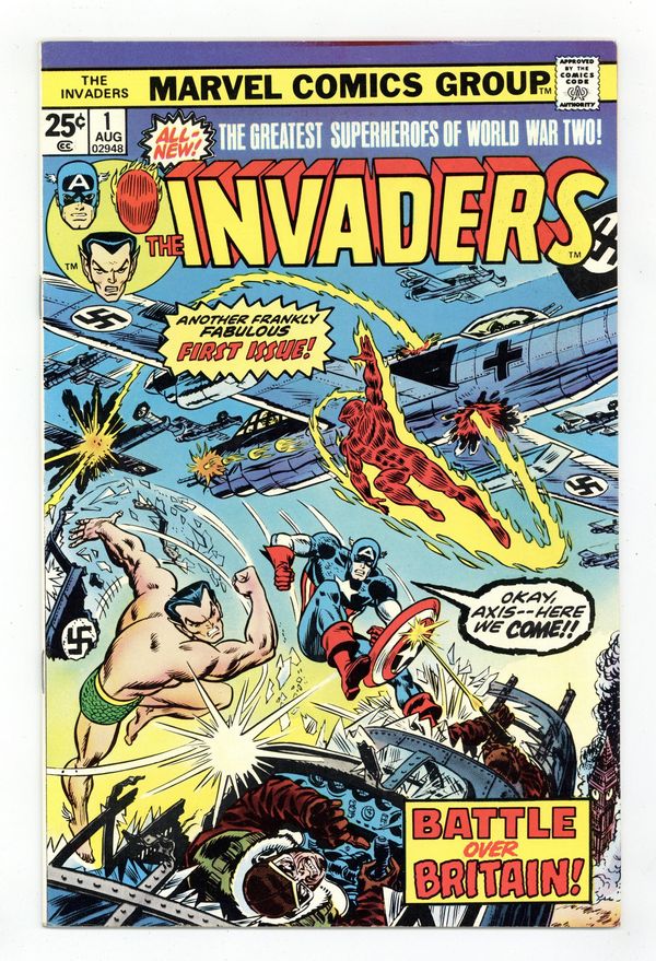 Part 1 of 2 - "The Ring of the Nebulas!" Written by Roy Thomas. Art by Frank Robbins and Vince Colletta. The greatest heroes of the Golden Age, Captain America, Human Torch, and Prince Namor alongside their sidekicks Bucky and Toro, unite to win World War II and take down the Axis Powers once and for all. But when Captain America rescues a mysterious woman of great beauty, the Invaders suddenly find themselves confronted with a threat greater than anything they've ever faced before. 32 pages FC. Marvel Value Stamp. Cover price $0.25. Grade: VF- 7.5 explanation of grade Condition: Used (collectible)