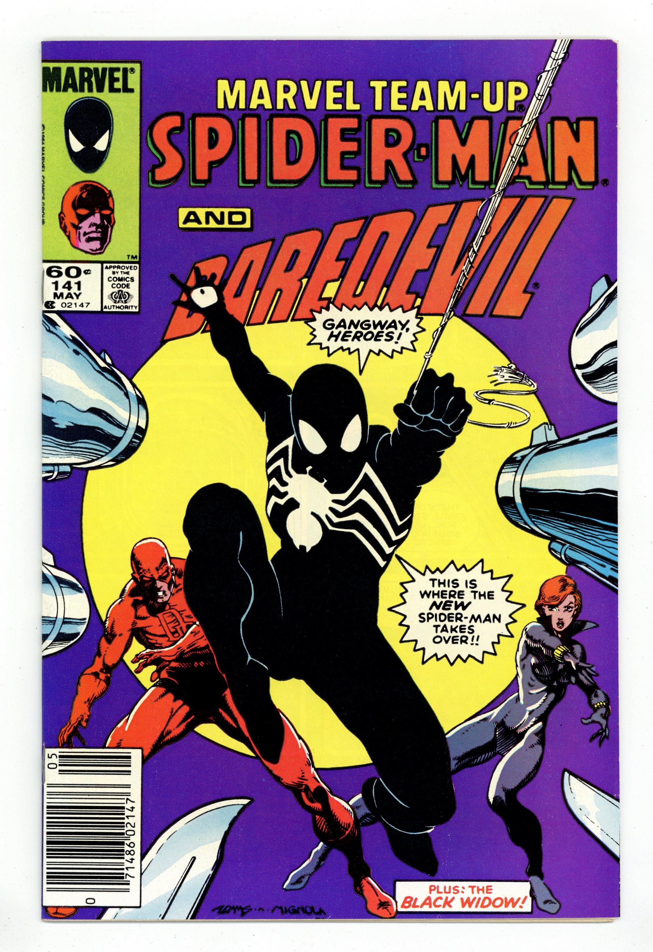 Direct Edition. "Blind Justice!" Part 2 of 2. Guest-starring Spider-Man, the Black Widow, and Daredevil. Plot by Tom DeFalco. Script by Jim Owsley. Art by Greg LaRocque (breakdowns) and Mike Esposito (finishes). Cover by Art Adams and Mike Mignola. Spider-Man is missing! What has happened to the spectacular one? Regardless, Daredevil and the Black Widow must keep working on the pawnbroker murder case in order to prevent an innocent man from going up the river! The Man Without Fear and Natasha just about have the case solved, when the web-slinger suddenly reappears...in a brand new costume! They'll be glad to have Spidey's help to finish this caper...or will they? Daredevil's deal with the Kingpin may not go over too well with your friendly neighborhood Spider-Man! Cameo appearances by the Kingpin, the Arranger, and Dr. Curt Connors. (Notes: Spider-Man's new costume debuted this month in Amazing Spider-Man 252, Spectacular Spider-Man 90, and this issue. The letters page includes a letter from Marvel creator Stan Lee.) 36 pages. Cover price $0.60. Grade: FN/VF 7.0 explanation of grade Condition: Used (collectible)