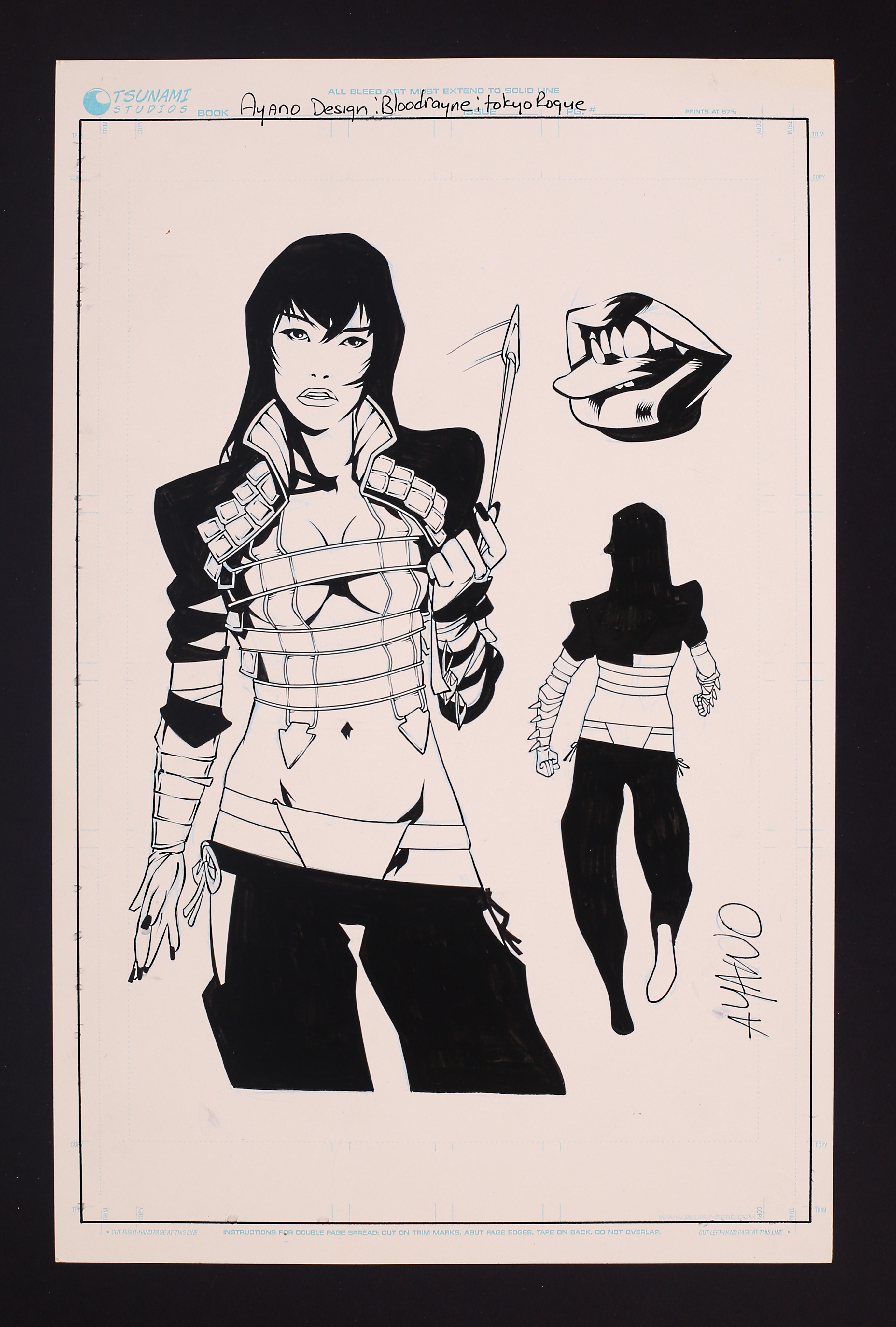 Bloodrayne: Tokyo Rogue (2008 Digital Webbing) Ayano Design Sheet Pencils and Inks by Jake Bilbao. The Japanese Vampire Ayano is one of the more interesting designs in the Bloodrayne comics, with a strappy outfit that's not just revealing- it's deadly! Armed with spiked forearms, bladed straps, and false teeth, this is one dangerous vampire! Pencil and ink on Tsunami Studios art board. 11" x 17", B&W.