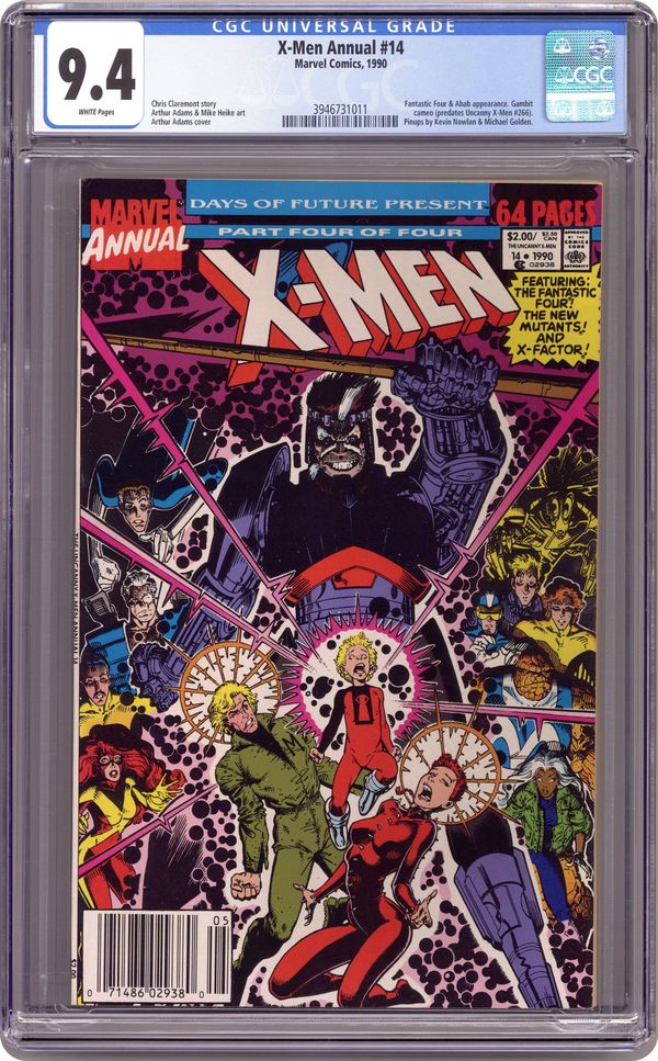 Direct Edition. Days of Future Present part four of four "You Must Remember This" Guest starring the Fantastic Four, the New Mutants, and X-Factor. Script by Chris Claremont, pencils by Art Adams, inks by Dan Green, Bob Wiacek, Al Milgrom, Art Thibert, and Steve Mancuse. First appearance of Gambit (brief cameo). Wolverine, Jubilee, and Psylocke star in "The Fundamental Things." Script by Claremont, pencils by Mark Heike, inks by Geof Isherwood. Pin-ups by Kevin Nowlan and Michael Golden. Adams cover. 68 pgs. Cover price $2.00. Grade: CGC 9.4 explanation of grade Condition: Used (collectible)