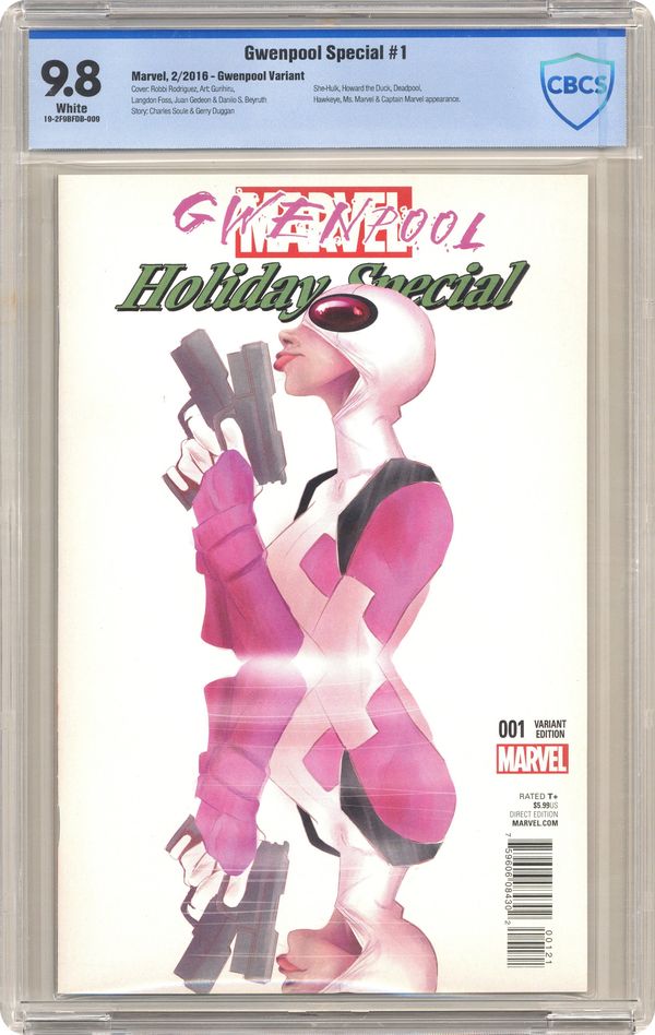 Gwenpool Variant Cover by Robbi Rodriquez. Written by Charles Soule, Margaret Stohl, Gerry Dugan and Christopher Hastings. Art by Langdon Foss, Juan Gedeon, Danilo S. Beyruth and Gurihiru. AN ALL-NEW, ALL-DIFFERENT MARVEL HOLIDAY SPECIAL! She-Hulk throws a holiday party and invites the entire Marvel U! Deadpool teams up with both Hawkeyes - Kate and Clint - to…stop a pickpocket?! Ms. Marvel takes on her most dangerous threat yet: the holiday blues! And then there's the reason for the season(al special): GWENPOOL! Yup, you read that right - Gwen. Pool. C'mon, you know you're curious. 60 pages, full color. Rated T+ Cover price $5.99. Grade: CBCS 9.8 explanation of grade Condition: Used (collectible)