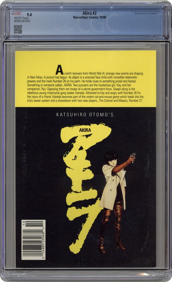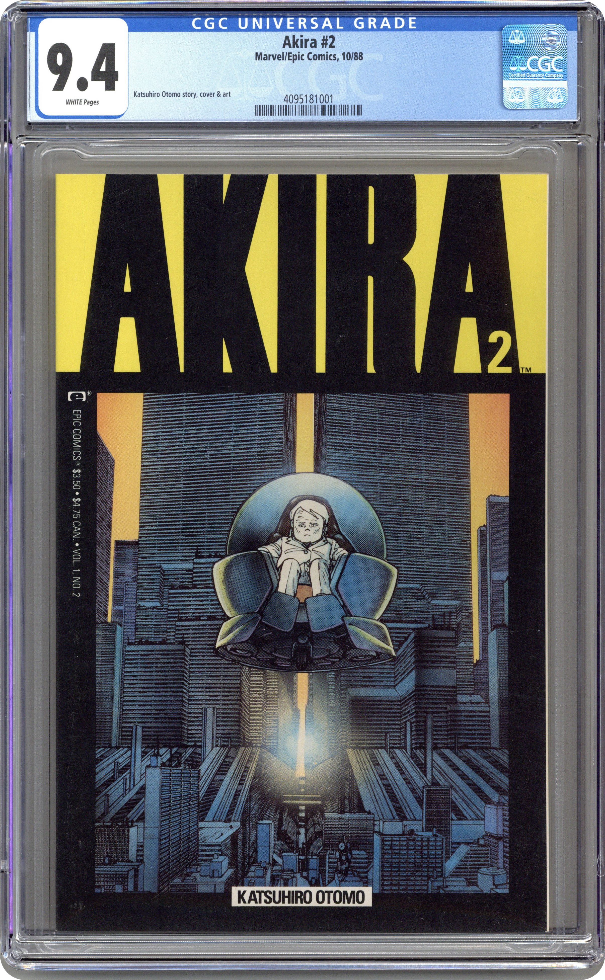 Ended Dec 13 2022 Winning Bid $28 Tetsuo and Kaneda get caught up in the governments pursuit of the mysterious Mutant #26; the Colonel wants to control the power of Akira, but hes not the only one. The first English translation of Katsuhiro Otomos influential manga series. Story, art and cover by Otomo. Color by Steve Oliff. Mature readers. Cover price $3.50. Cover price $3.50. Grade: CGC 9.4 explanation of grade Condition: Used (collectible)