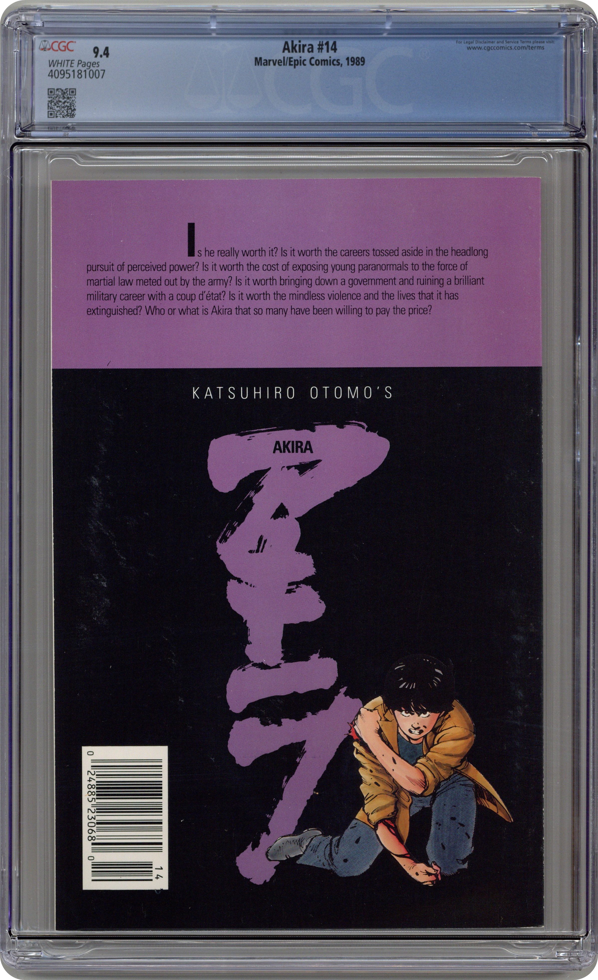 Ended Dec 15 2022 Winning Bid $15 The battle for control of Akira continues, as Kay, Kaneda, and Chiyoko sneak into Nezu's compound, but find themselves fighting not only Nezu, but also the Colonels forces and Lady Miyako. The first English translation of Katsuhiro Otomos influential manga series. Story, art and cover by Otomo. Color by Steve Oliff. Also includes a behind-the-scenes article about translating Marvels edition of Akira. Mature readers. Cover price $3.50. Cover price $3.50. Grade: CGC 9.4 explanation of grade Condition: Used (collectible)