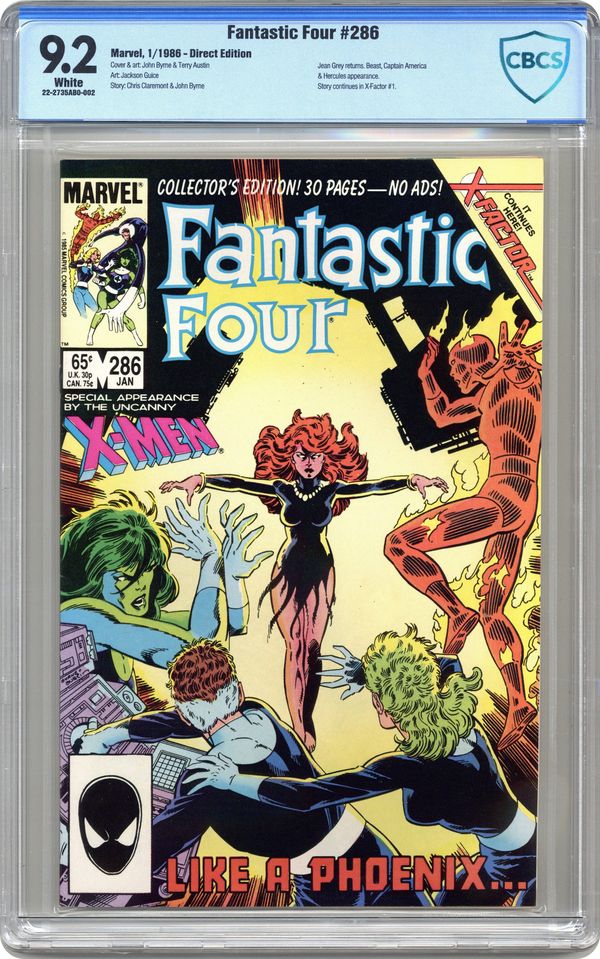 Ended Nov 22 2022 Winning Bid $22 Direct Edition. Last 65-cent issue. Return of Jean Grey: Part 2 of 3 - X-Factor tie-in. "Like a Phoenix!" Guest-starring the Uncanny X-Men and Avengers. Story by John Byrne. Art by John Byrne and Terry Austin. Cover by John Byrne. Story continued from Avengers (Vol. 1) #263. Don't miss the startling return of Jean Grey! How did she survive, and where has she been? The answers will shock and surprise you. Plus, this issue sets the stage for the return of the of the original X-Men! Story continues in X-Factor (1986-1998 1st Series) #1. 36 pgs. Cover price $0.65. Grade: CBCS 9.2 explanation of grade Condition: Used (collectible)