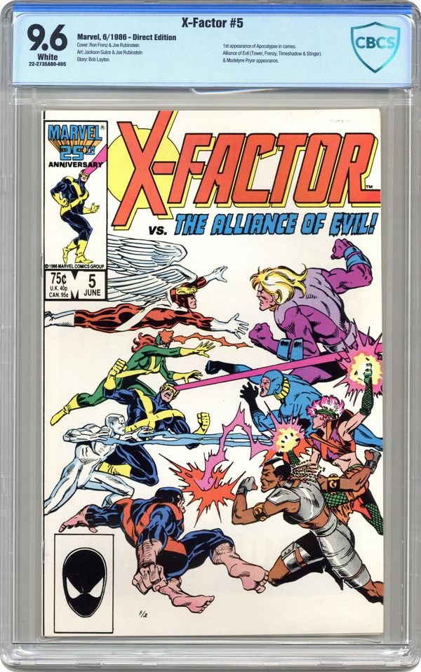 Ended Dec 5 2022 Winning Bid $48 Direct Edition. "Tapped Out!" Part 1 of 2. 1st appearance of Apocalypse (shadowed cameo). Story by Bob Layton. Art by Jackson Guice and Joe Rubinstein. Cover by Ron Frenz and Joe Rubinstein. It's a classic super-hero/super-villain throw-down when X-Factor must battle the Alliance of Evil (Frenzy, Tower, Stinger, and Timeshadow) for the life of a mutant. Featuring a new menace by the name of Apocalypse, an evil mutant who will become a major thorn in the sides of the X-Men and X-Factor. Cover price $0.75. Grade: CBCS 9.6 explanation of grade Condition: Used (collectible)